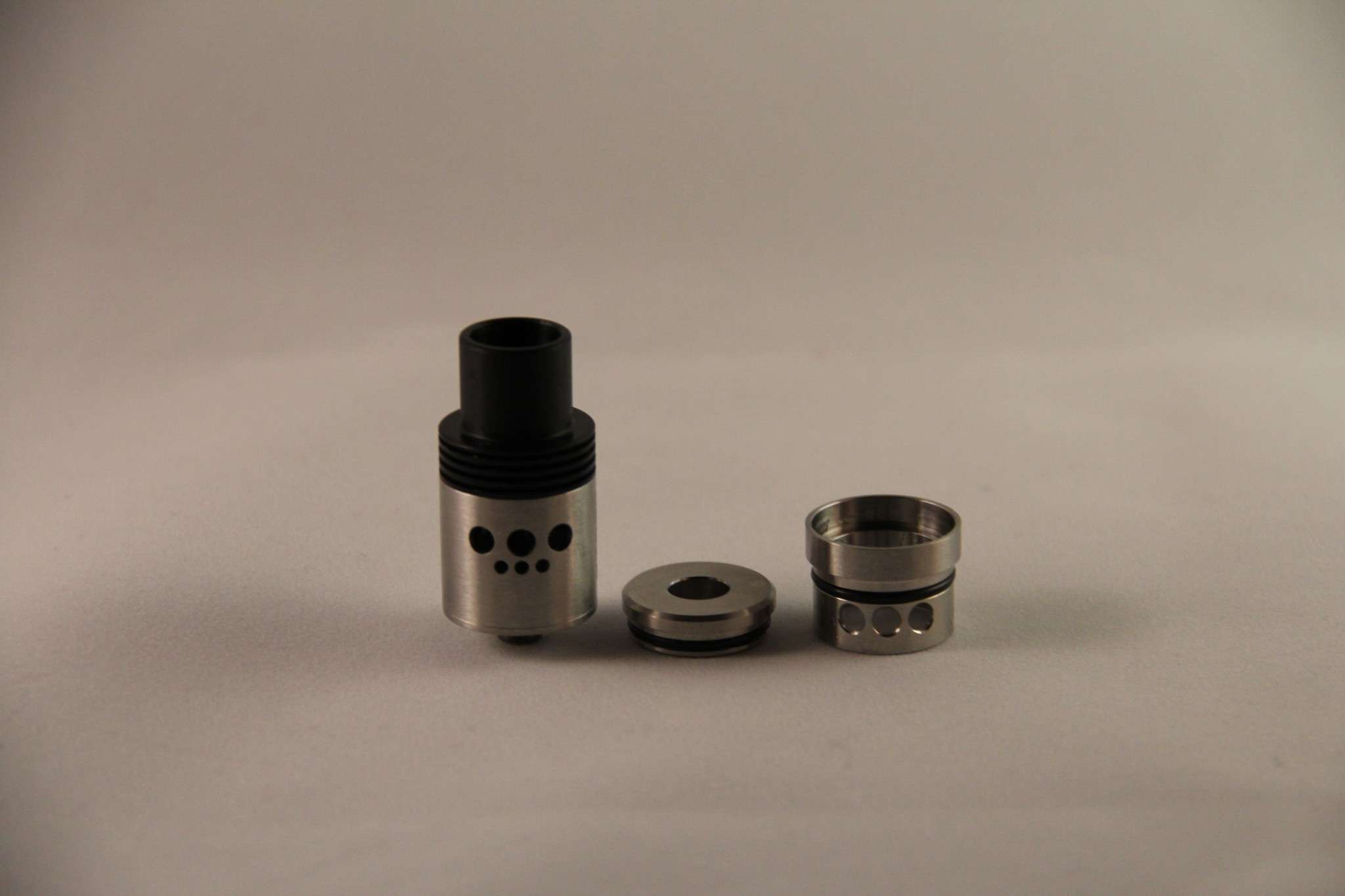 Airek RDA состоит из четырех частей: топ-кэп с 510 коннектером, кольцо регулировки обдува, тело и база для установки спирали.