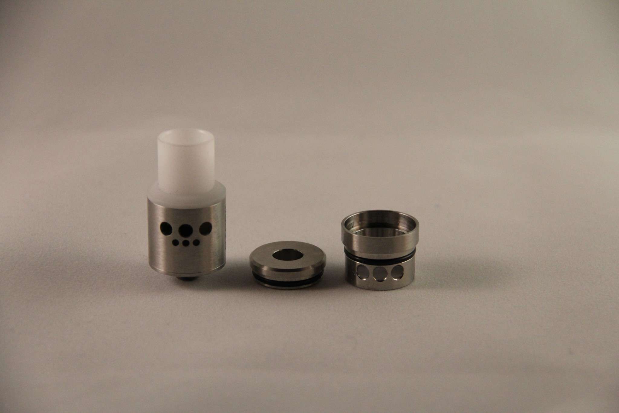В стандартной комплектации дрип-тип не идет, однако все сторонние подходят к атомайзеру без проблем. Но, как мы помним, данная дрипка сделана для сурового клаудчейсинга, который обычно сопутсвуется дрип-топом или топ-кэпом с широким, уже встроенным дрип-типом (иначе именуемые chuff-style caps). На Айрек отлично садятся таковые от Tobh Atty:
