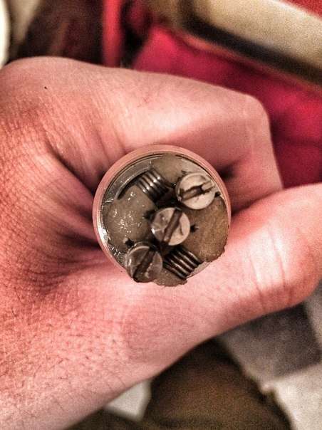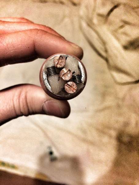 Намотка на третьем фото — один коил из 0,64 кантала, 5 витков на 3 мм оправы и второй коил из 8 кантала, тоже 5 витков на 3 мм. Жарит офигенно, намного лучше, чем тот билд, с которым я участвовал на контесте, даже не знаю, почему я этот не намотал…