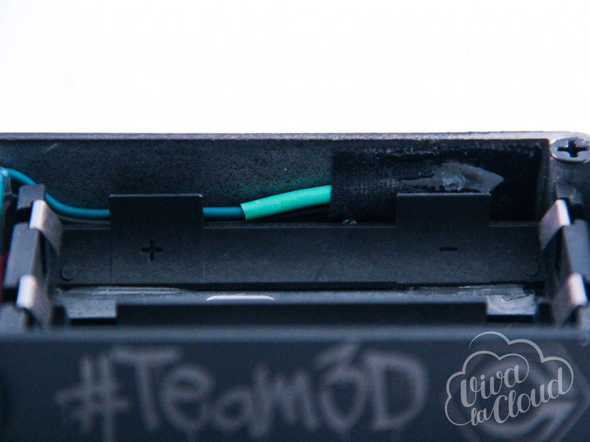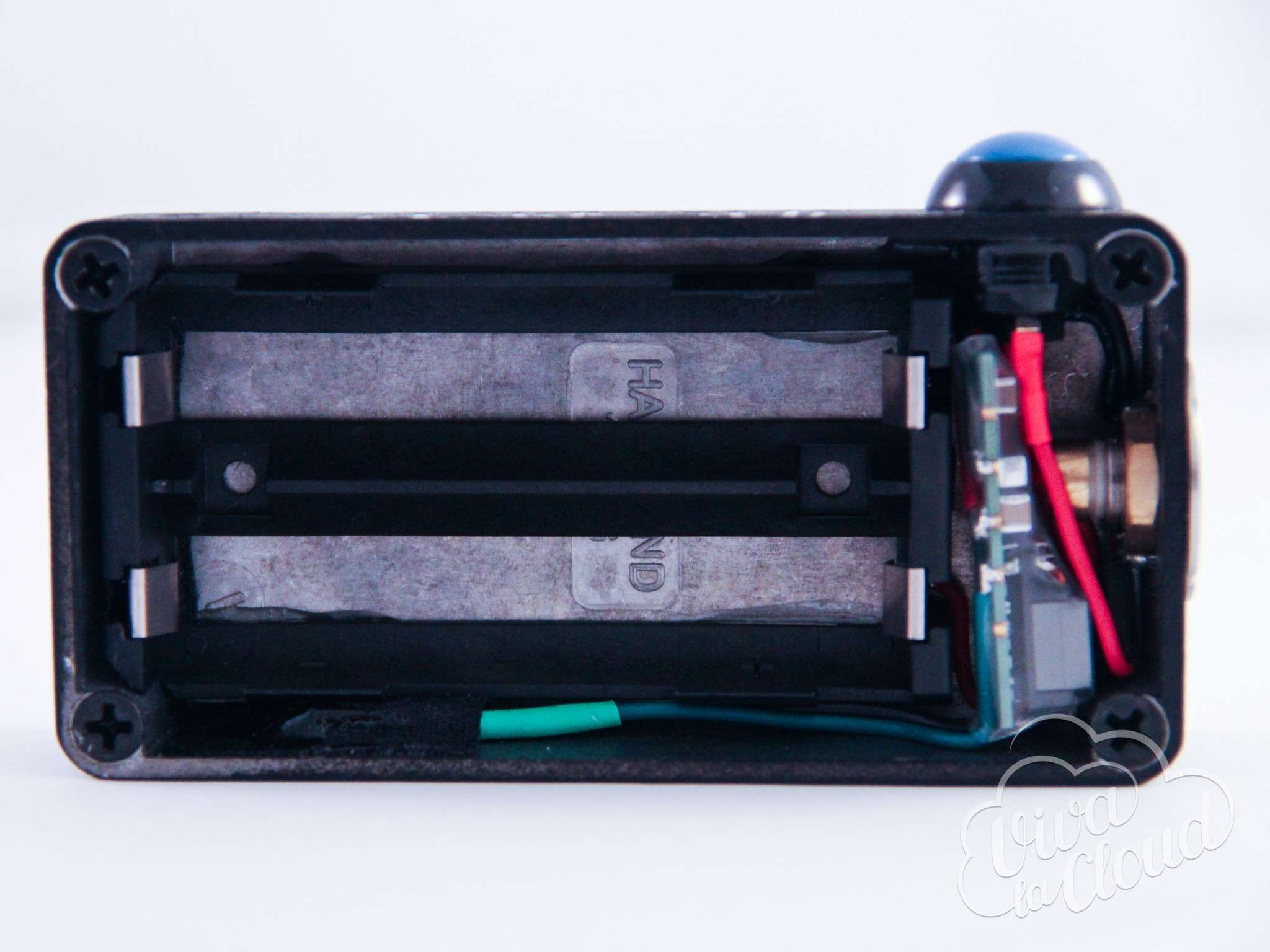 «Внутрянка», как вы можете видеть, весьма чистая. Плата аккуратно убрана в верхнюю часть и обтянута специальной защитной плёнкой. Проводка отлично зафиксирована — ничего не болтается и не отваливается. На салазках обозначены плюс и минус для правильной установки аккумуляторов.