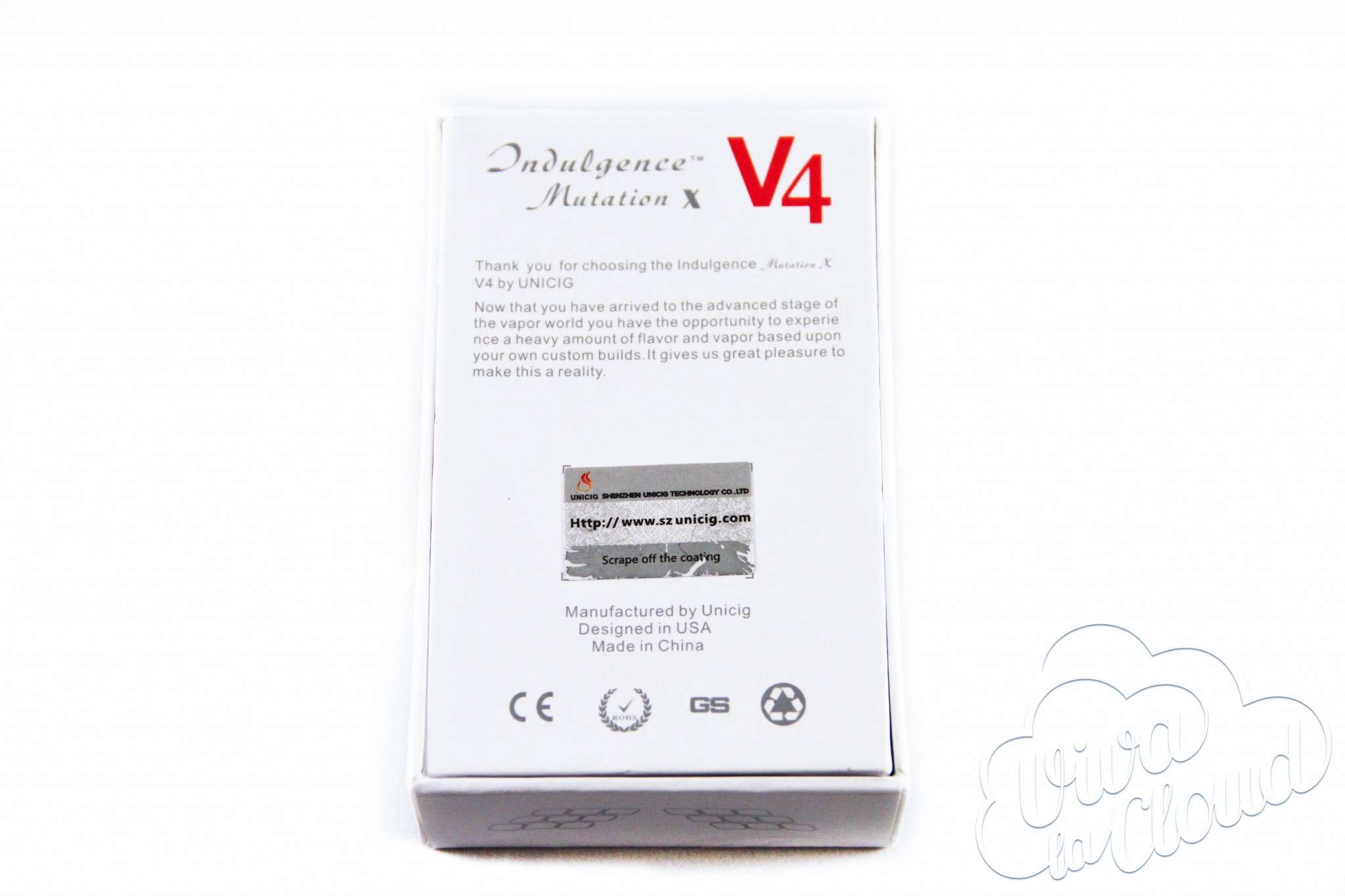 Mutation X v4 приходит в очень аккуратной белой коробочке, которая имеет минималистичный и приятный дизайн. На фронтальной стороне расположен контурный рисунок дрипки и название. На обратной стороне Indulgence благодарит вас за покупку и предоставляет вам возможность проверить устройство на оригинальность. Для этого необходимо стереть защитный слой при помощи монетки или ногтя и проверить его на официальном сайте.