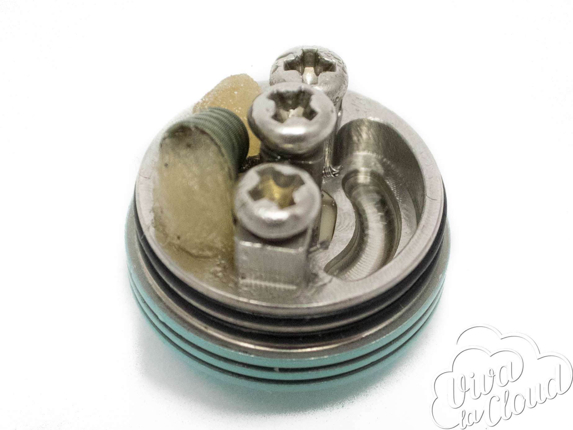 RDA выглядит очень красиво. Она пришла в руки редактору как подарок на день рождения, так что черный или стальной цвет показался скучным. В цвете Tiffany дрипка выглядит очень эффектно и стильно, особенно при использовании стеклянного дриптипа.