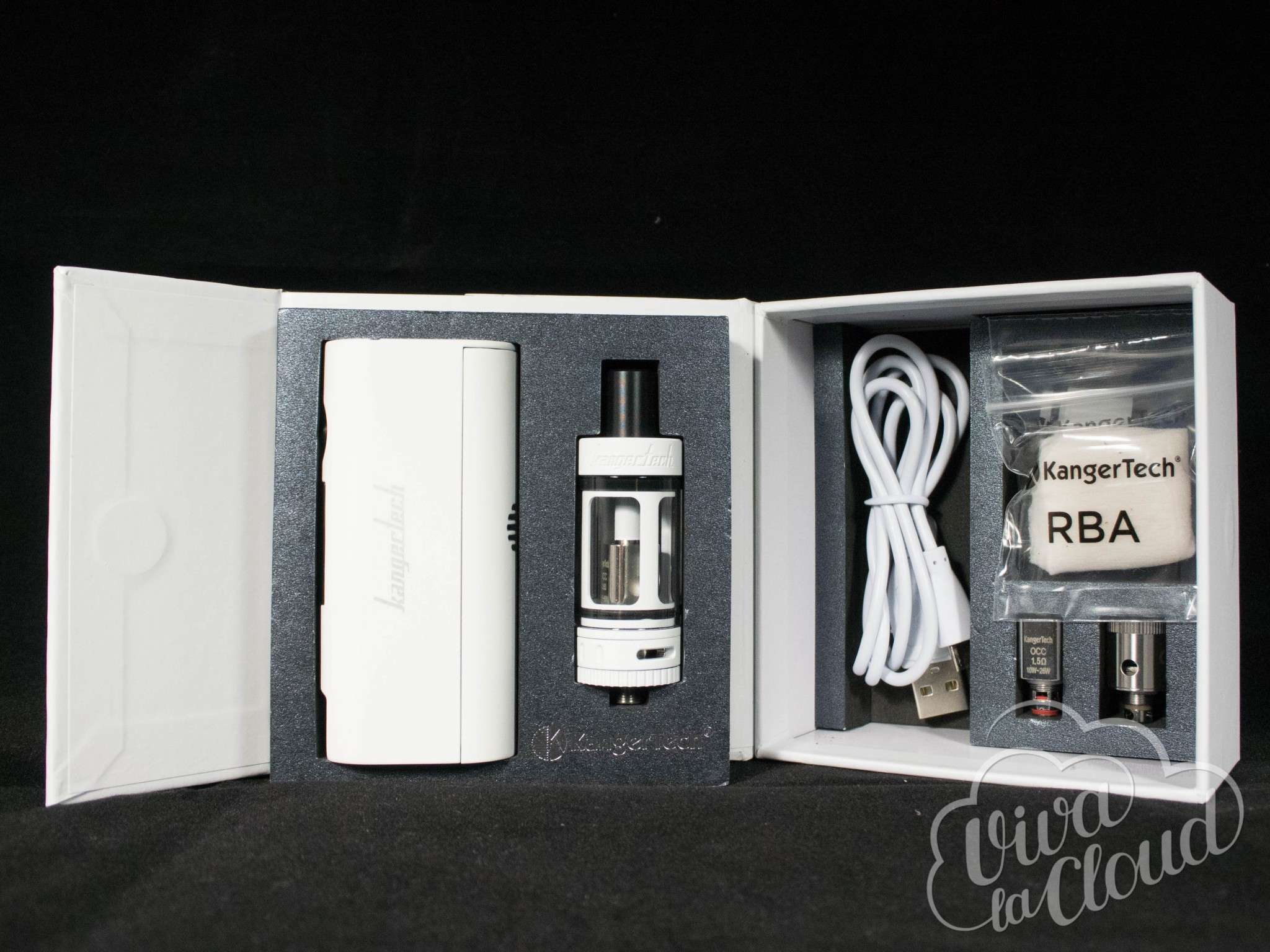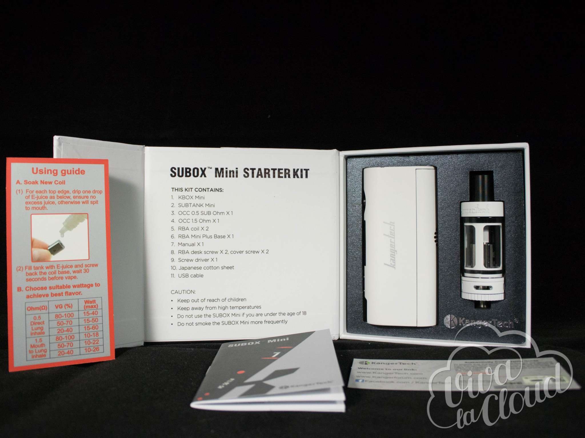 Subox Mini продается в двух цветовых решениях: белом и черном. Белая версия боксмода имеет черные кнопки, а черная — кнопки фирменного красного цвета Kanger. После открытия коробки перед нами предстаёт документация и список того, что входит в комплект: