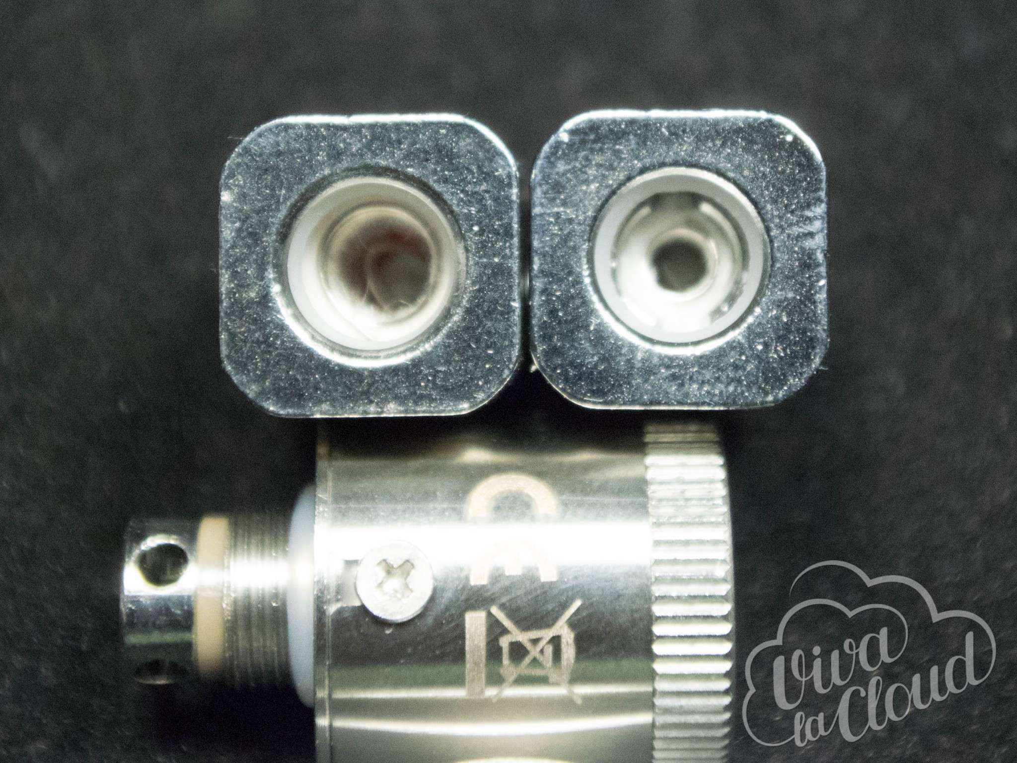 Обслуживаемая база тоже изменилась в лучшую сторону. Проблемы с подачей жидкости на первой версии были вызваны маленькими проточками испарительной базы. Здесь же по бокам есть два отверстия по 2 мм, а значит, что проблем даже с высокоглицериновой жидкостью не будет. Однако отверстия обдува можно было бы сделать и побольше.