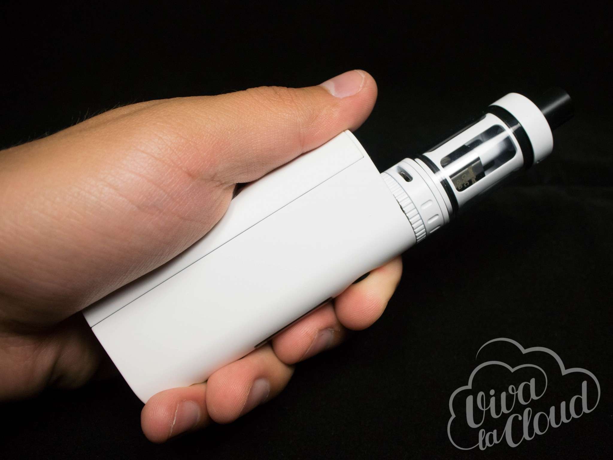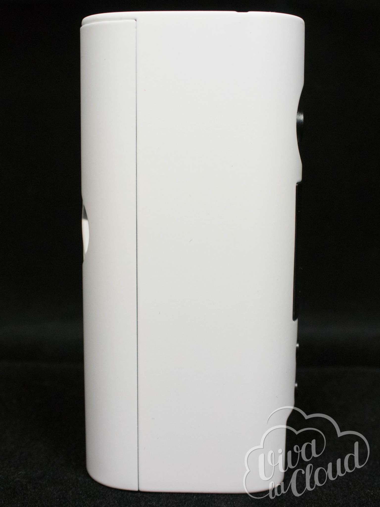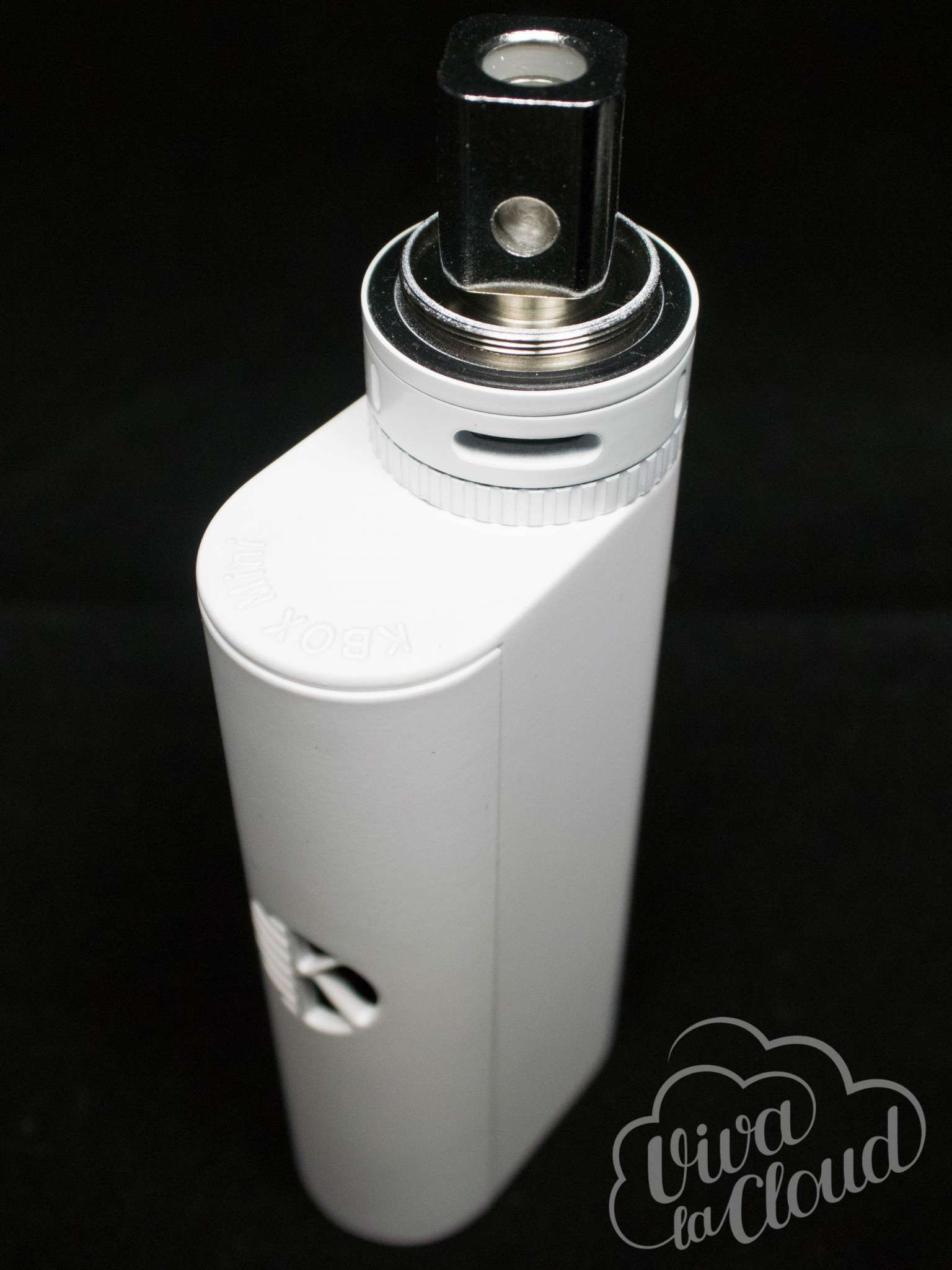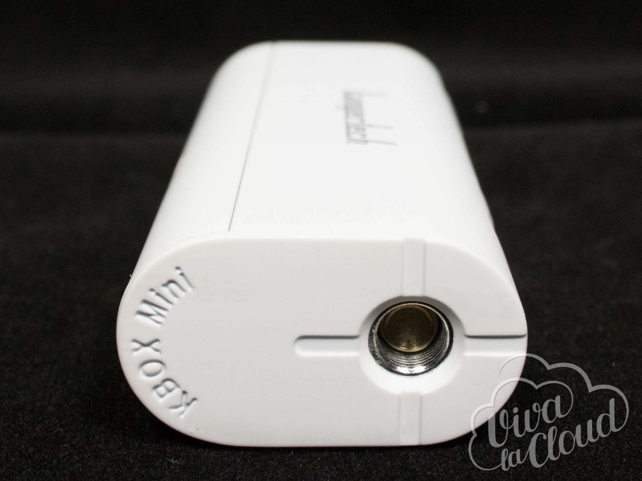 Очень простой внешне, поэтому и красивый. За счет скруглённых рёбер его удобно держать в руке. Крышка аккумулятора держится на магнитах и имеет вентиляционное отверстие в виде логотипа компании (похоже решение есть и в старшем брате KBOX). На просторах интернета нередко встречаются отзывы о том, что крышка люфтит, однако с нашим образцом такой проблемы не было. На «основном» ребре находится экран с индикаторами сопротивления, мощности и уровня заряда аккумулятора. Рядом с ним привычные всем кнопки управления и разъем microUSB для зарядки.