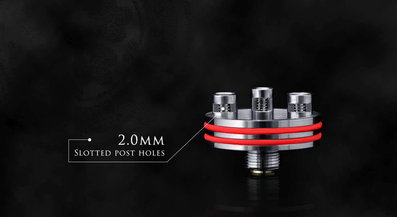 База имеет троехстоечный дизайн и отверстия в стойках размером в 2 мм под спирали. За счет того, что они вытянуты, ярые поклонники вкуса и небольших порно-койлов смогут с легкостью установить туда намотку, отвечающую всем предпочтениям. А 4 отверстия обдува легко остудят горячий пар.