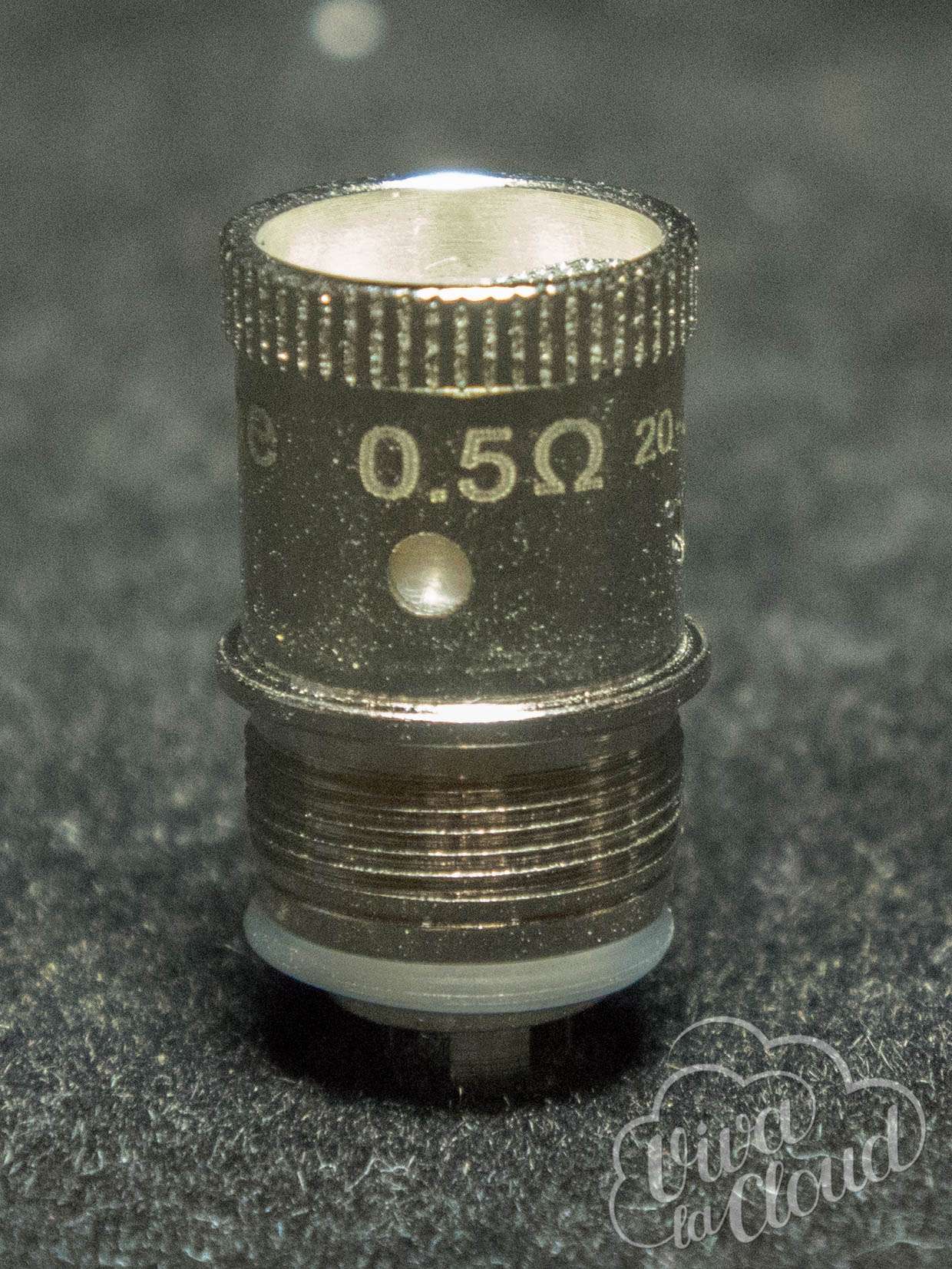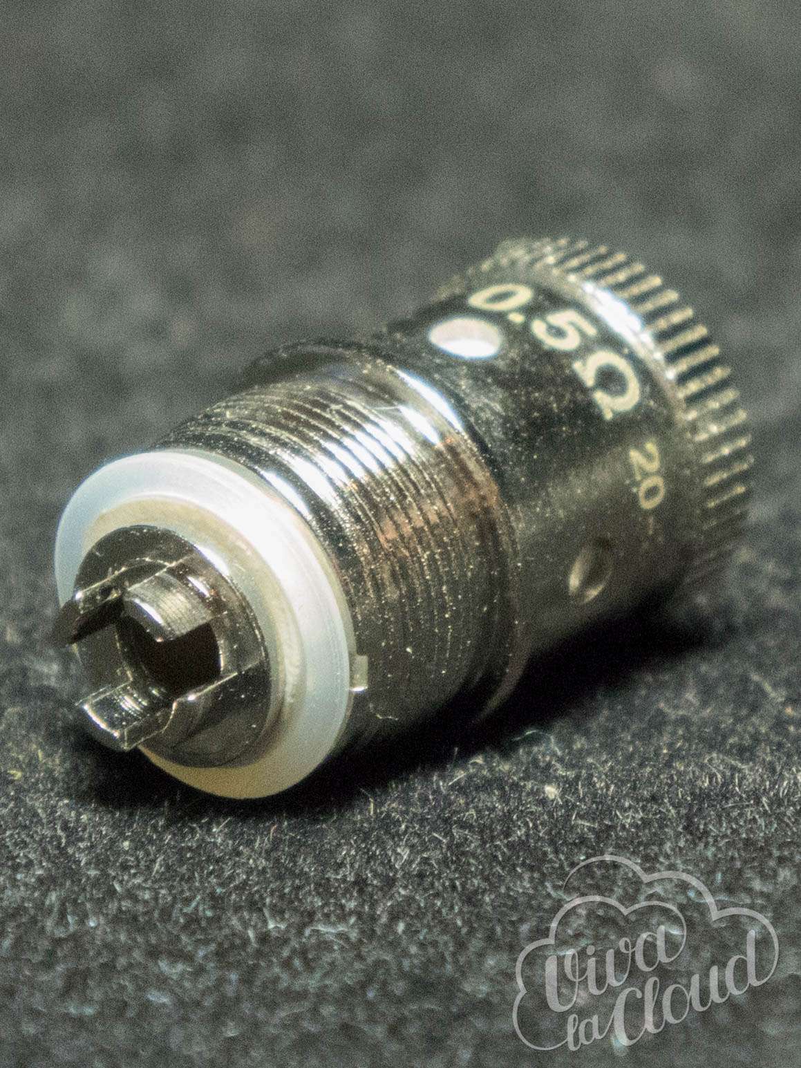 Сменные испарители поставляются в вариантах 0,3 и 0,5Ω. Они не содержат в себе ничего нового: вертикальная намотка с сеткой сверху и отверстиями для подачи жидкости на цилиндре. На первый взгляд, эти отверстия кажутся маленькими, но у нас с использованием никаких проблем не было, даже с жидкостями с балансом 80/20 VG/PG.