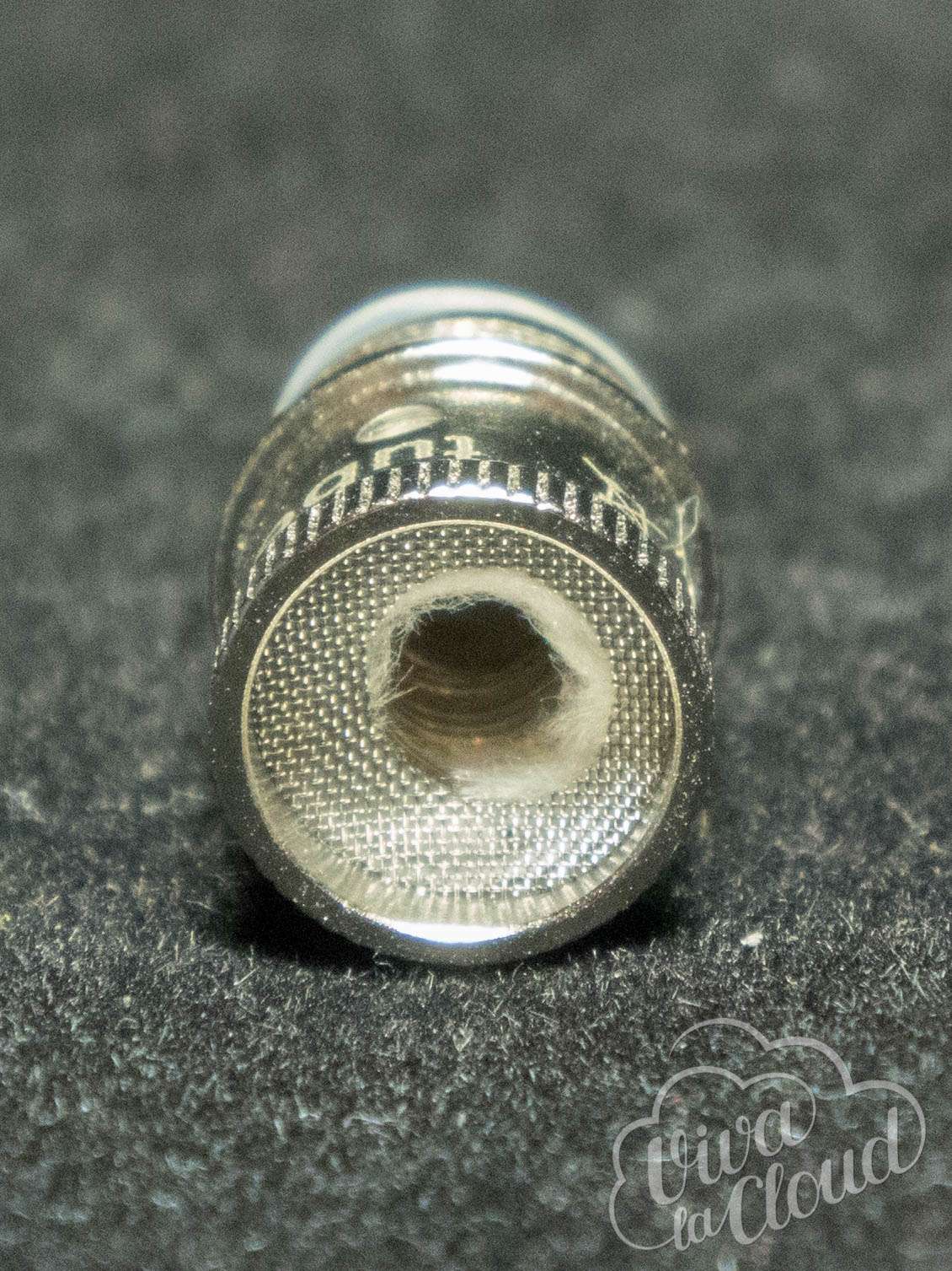 Пин 510-го коннектора сделан из латуни и выступает, на наш взгляд, недостаточно сильно, чтобы использовать его на механических гибридных модах. Да и зачем это в принципе надо? Бак задуман производителем как компаньон батарейному блоку, и с ним он работает отлично.