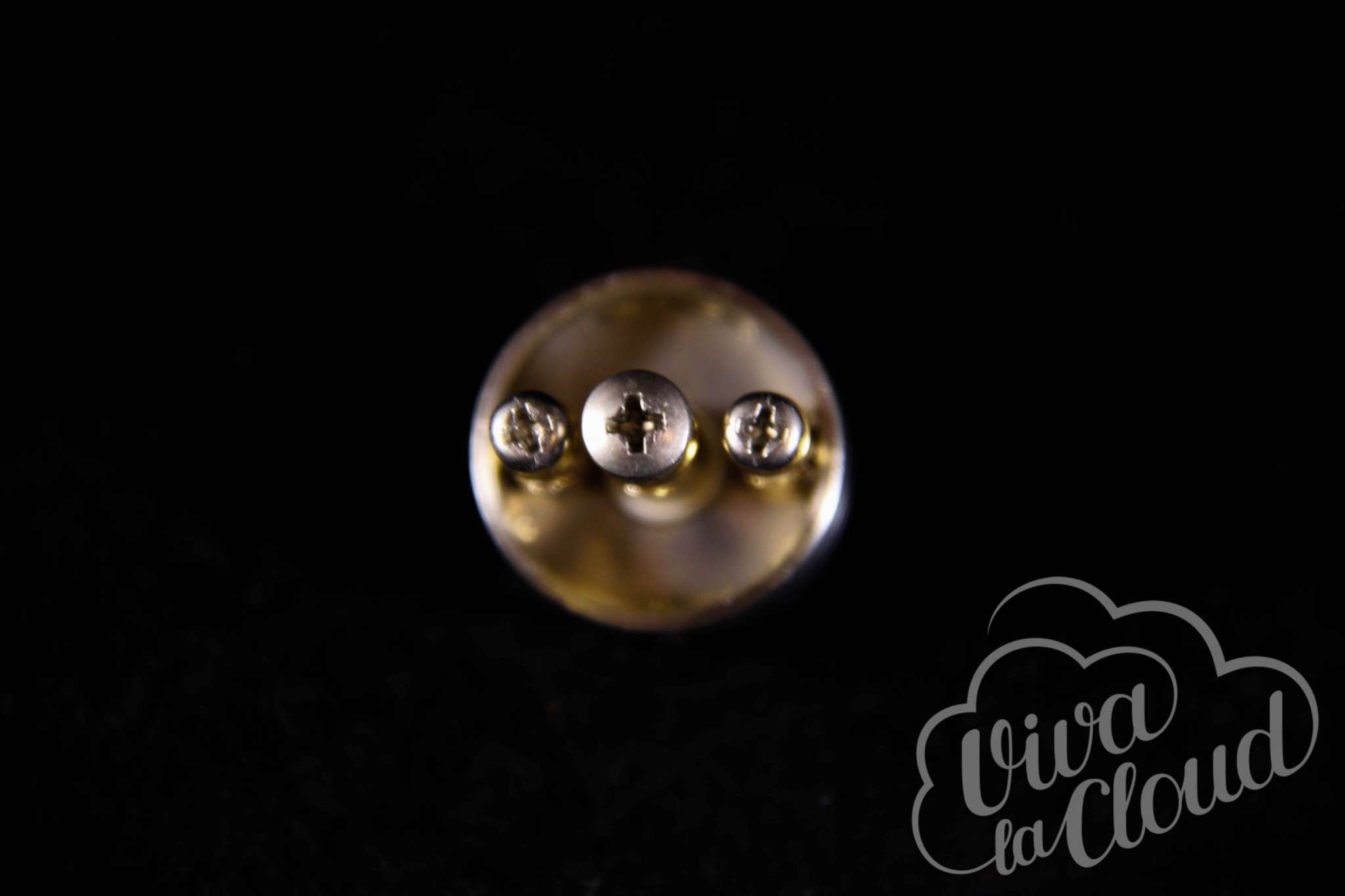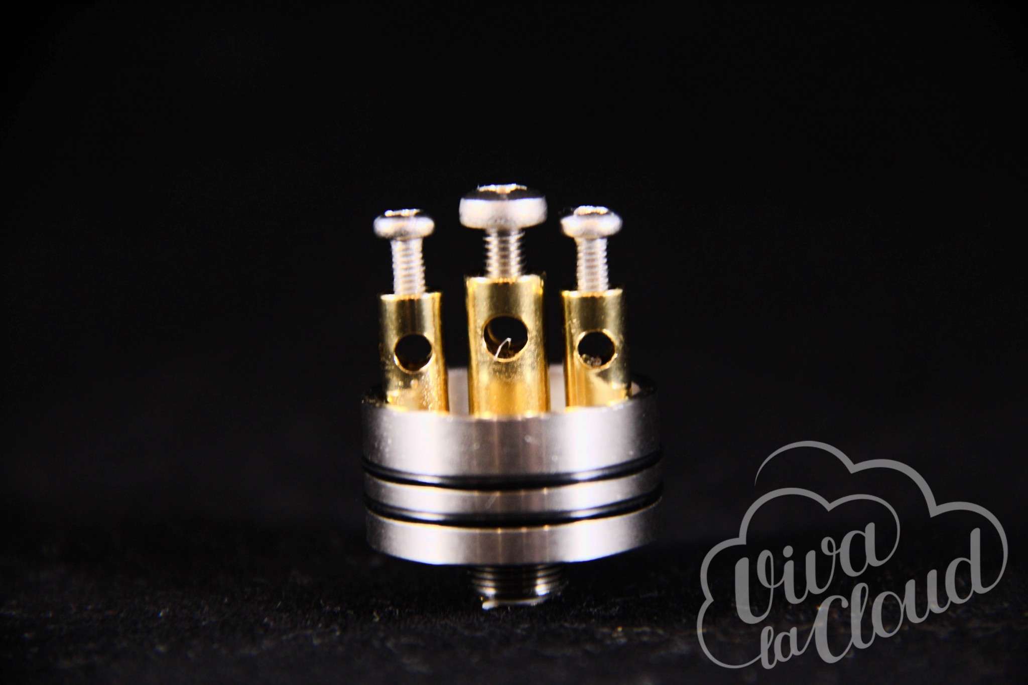 Стойки. И тут начинается самое интересное. Что же мы видим? Три отличные стойки с широкими отверстиями и довольно-таки большими винтами. Но постойте, почему одна боковая находится ближе к средней, чем другая? Этот дефект мы заметили только после того, как уже тестировали дрипку два дня. что Beyond Vape и в этот раз нас подвели. Как в оригинальной RDA можно допустить такое? Плохо.