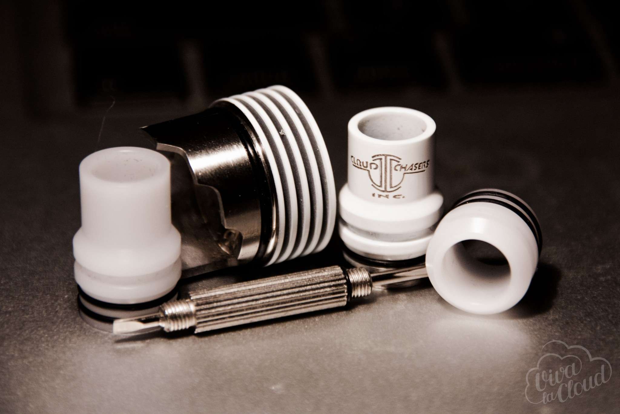 В базовый комплект входят: сам атомайзер, отвертка (которая у нас сразу же прокрутилась), аж два дрип-типа — один из нержавейки, другой из делрина, переходник из делрина под классические 510-е дрип-типы, две гексагональных стойки (медная и стальная), два изолятора (гексагональный и обычный), три сменных болта стоек, дополнительный пин коннектора, сменные о-ринги под дрип-типы и саму дрипку, две заготовленные спирали и немного хлопка. Фух!