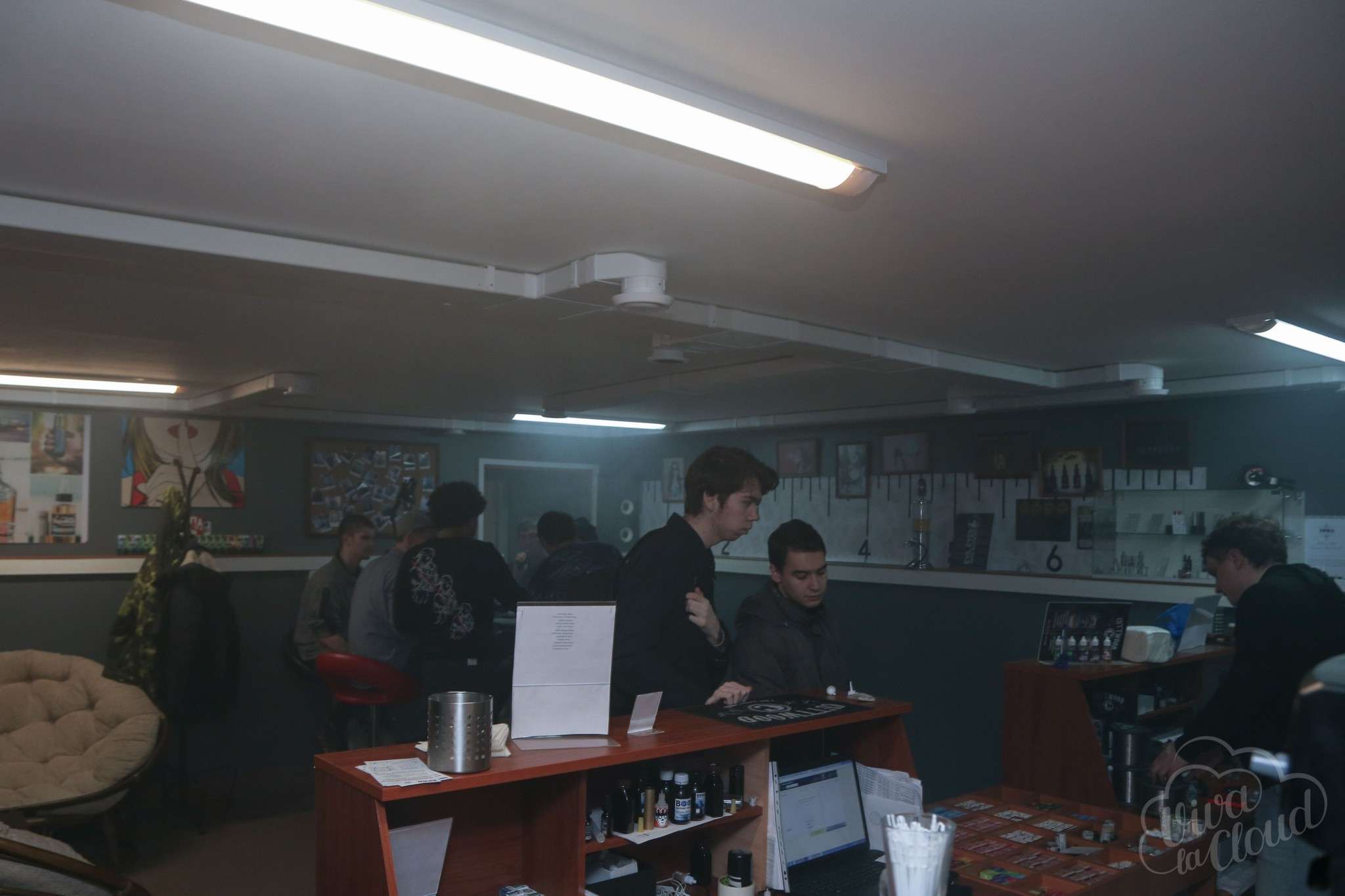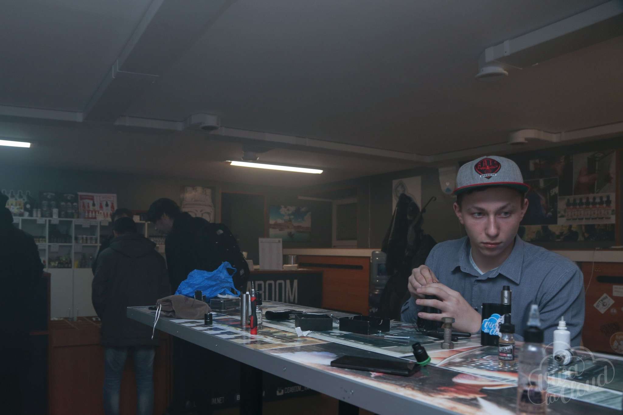 Мы проводили первый клауд-контест в городе. Народу собралось даже больше, чем предполагали. Мы даже не могли представить, что придет столько людей. Наше помещение было запарено до такой степени, что у нас из окна просто «валило», прямо вот капитально «валило». Мы взяли большую комнату в никому не нужном здании, сделали отдельную комнату с местными производителями жидкостей (та, кстати, был Naval’s Choice) и контест довольно-таки неплохо прошел. Победителей ждал довольно внушительный приз — вся линейка премиум жидкостей от спонсоров: Cuttwood, Naval’s Choice и так далее. В общем-то все «напарились», познакомились и узнали друг друга.