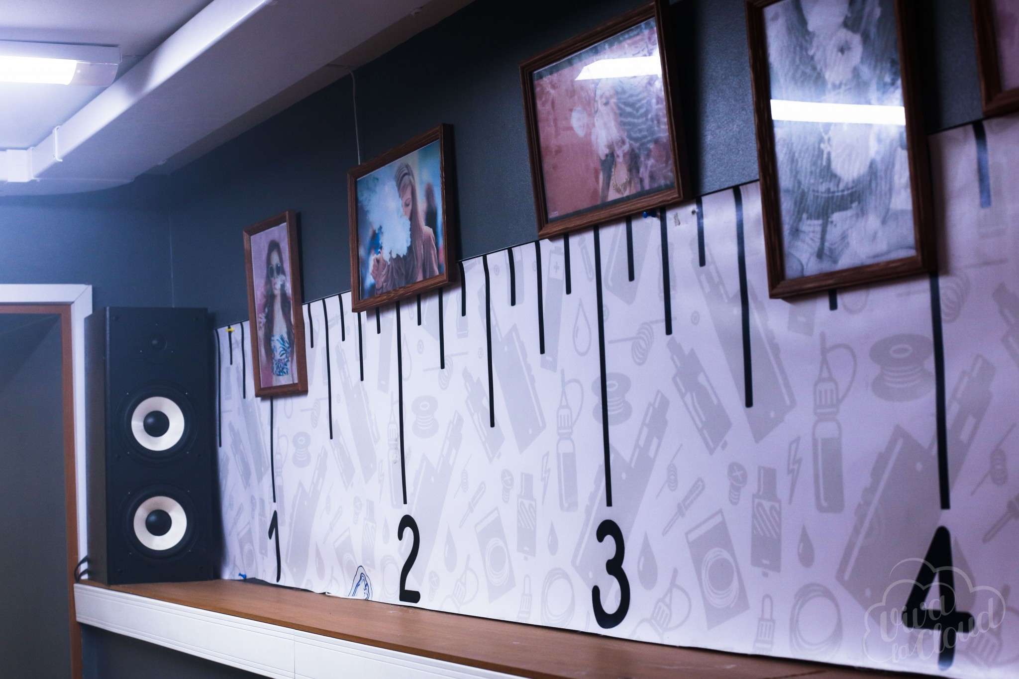 Между креслами в свою очередь расположилась стена для стикербомбинга, притом только на вейп-тематику. Такое место уже становится классикой для большинства вейпшопов.
