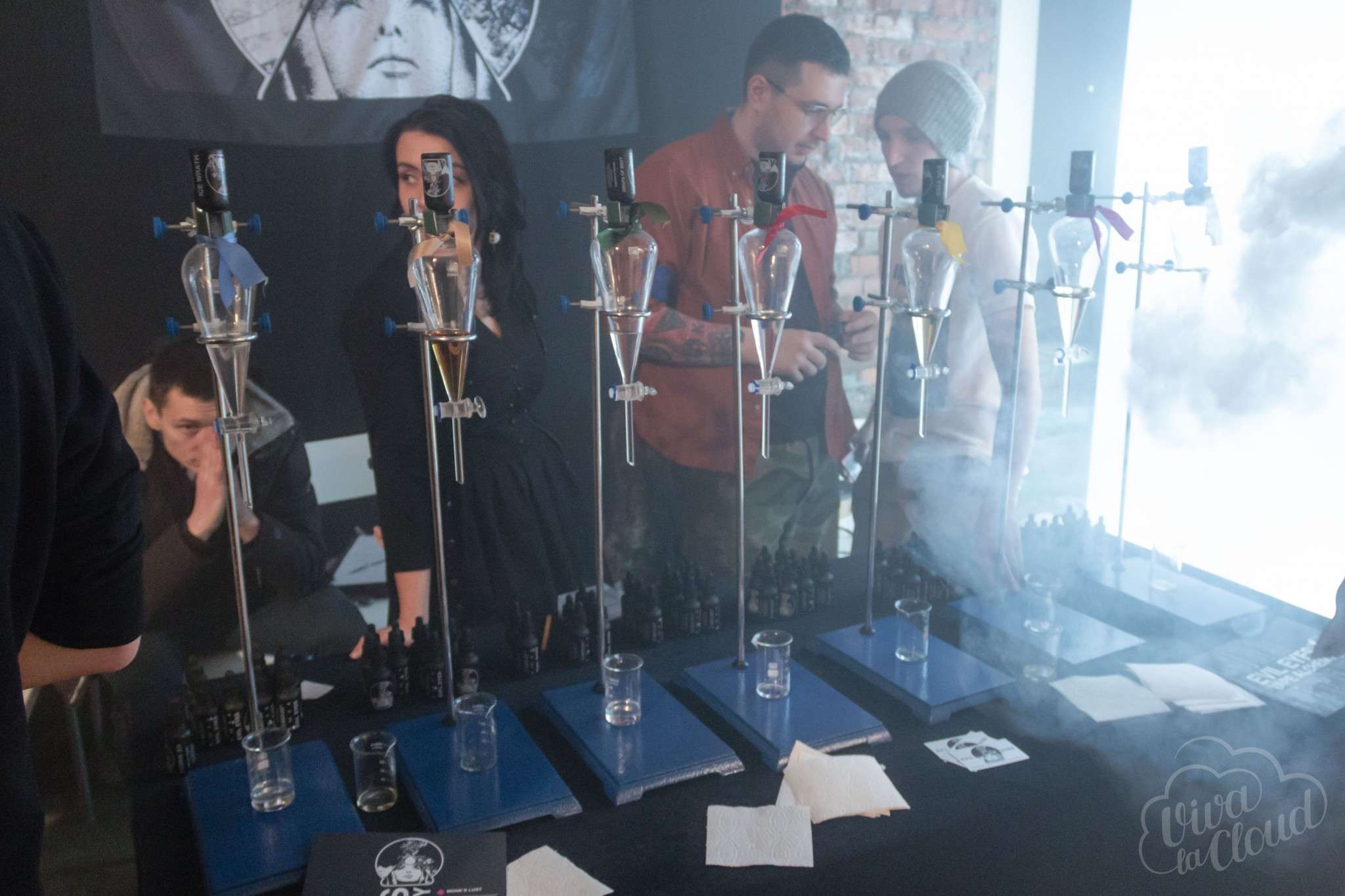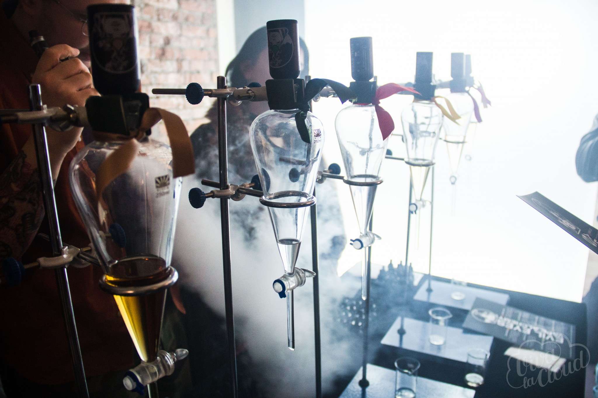 Из названия бренда понятно, что тут всё стилистически пропитано «алхимией». Но ребята смогли это подтвердить на деле: под каждый вкус у них были своеобразные «раздатчики» жидкости, сделанные из лабораторных воронок.
