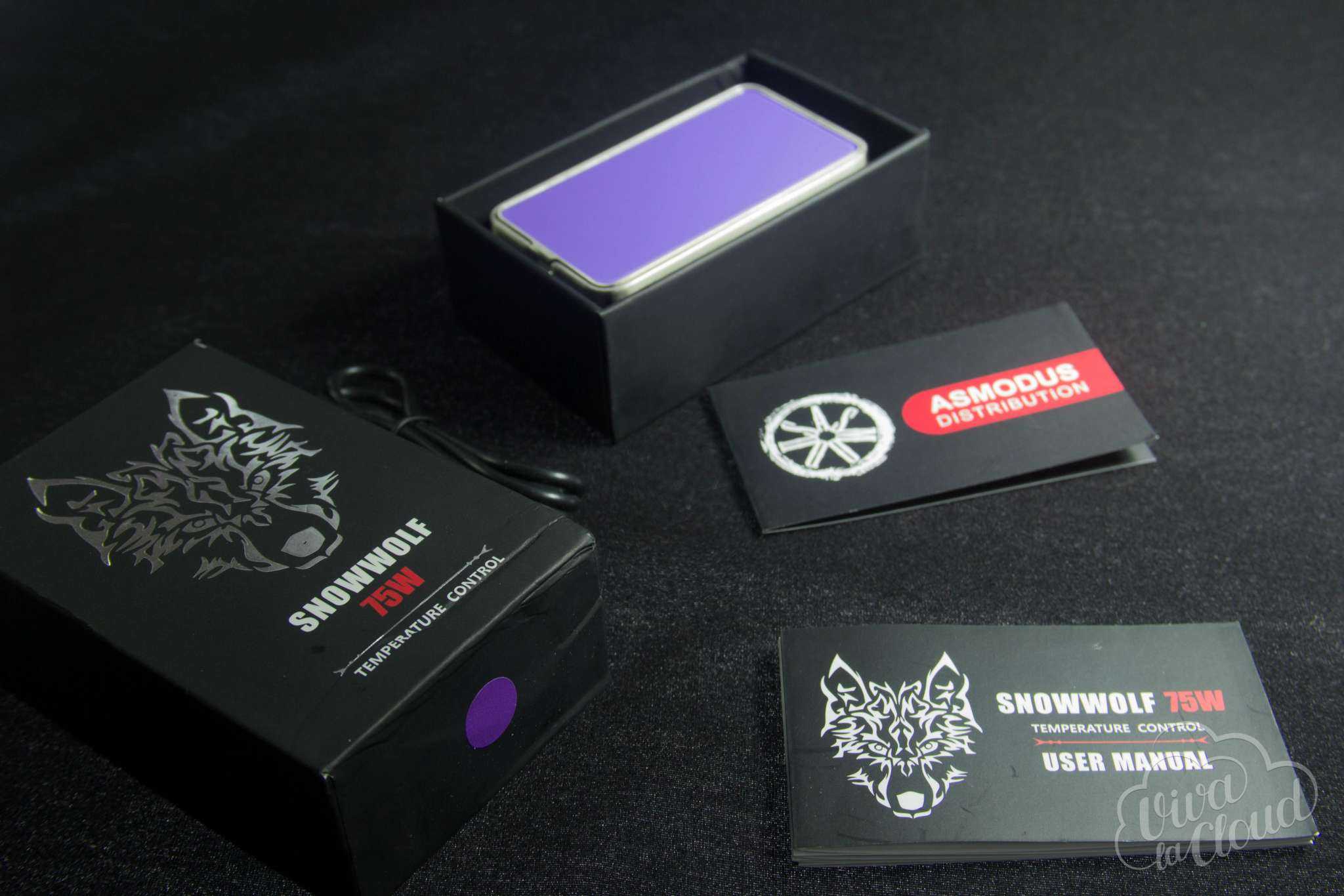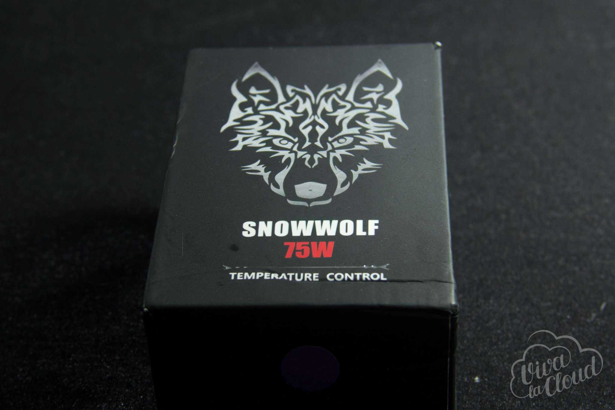 Поставляется Snow Wolf 75w в картонной коробочке с очень приятной типографией. С крышки на вас смотрит серебряный волк. На коробке располагается наклейка-маркировка, отображающая цвет девайса.