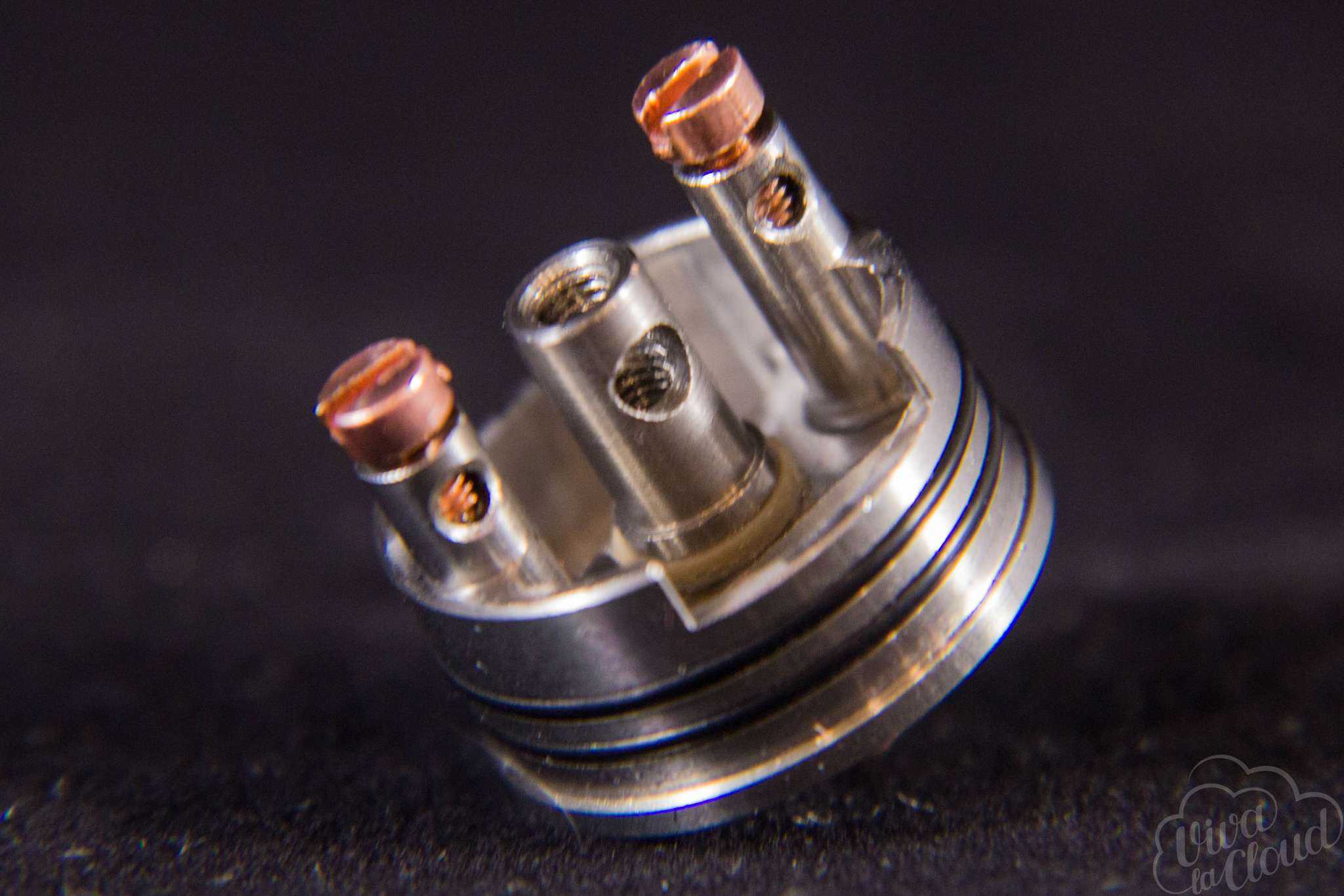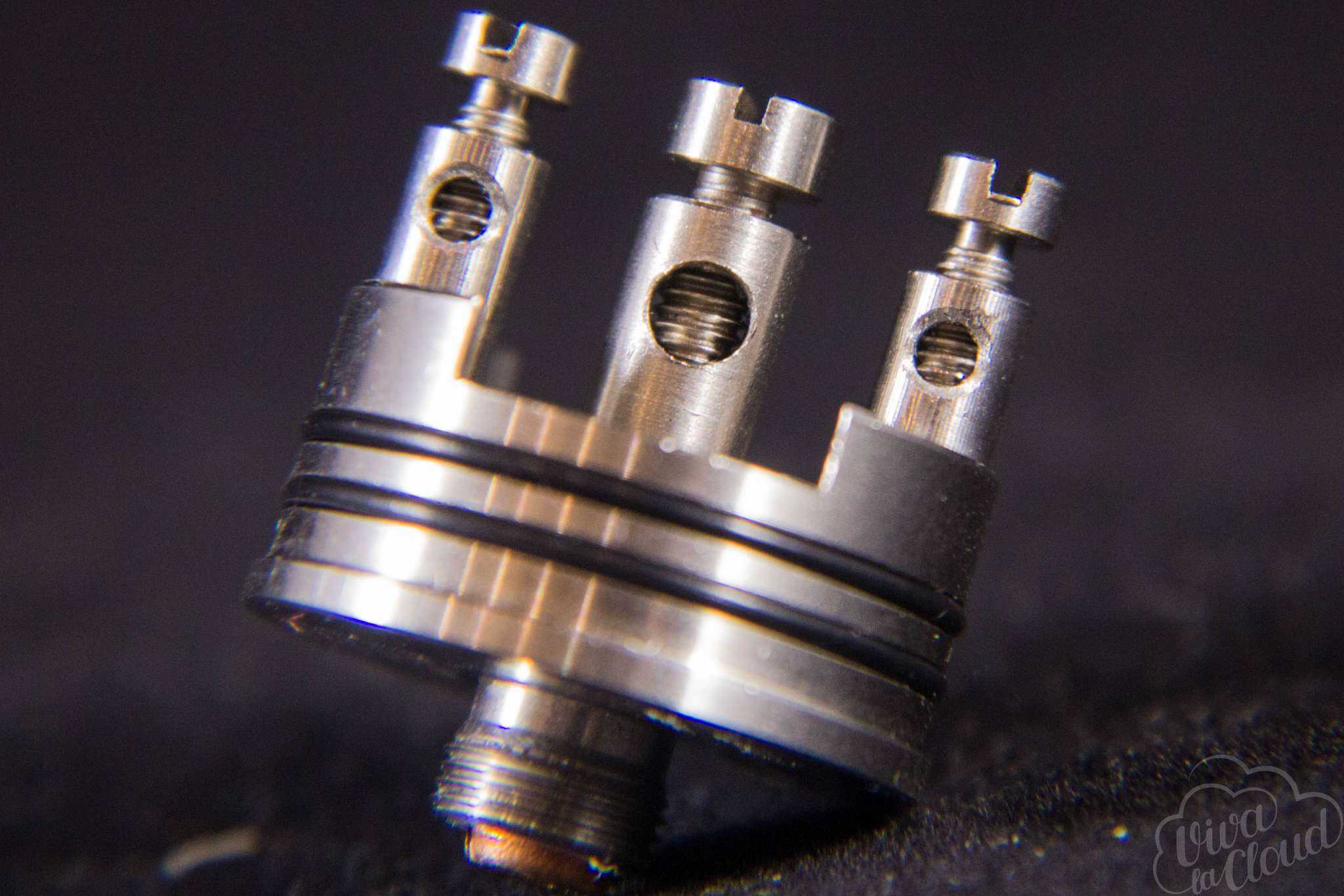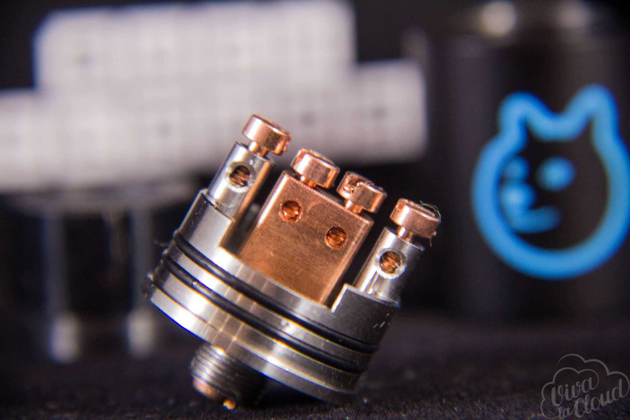 Изначально в базе уставлена массивная раздвоенная стойка из меди, которая должна снизить внутренние просадки RDA. Отверстия для установки спиралей имеют диаметр 2,2 мм каждая.