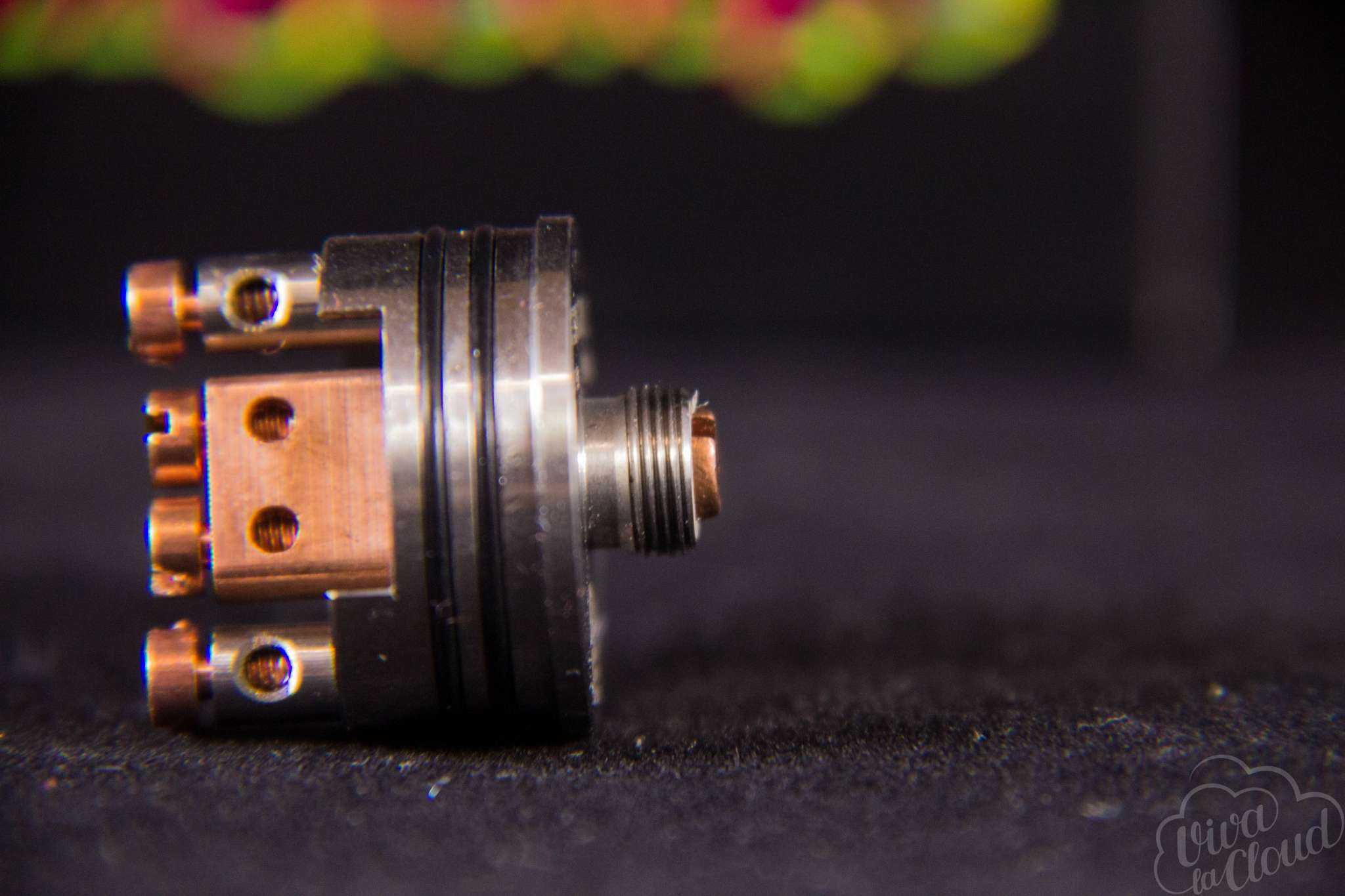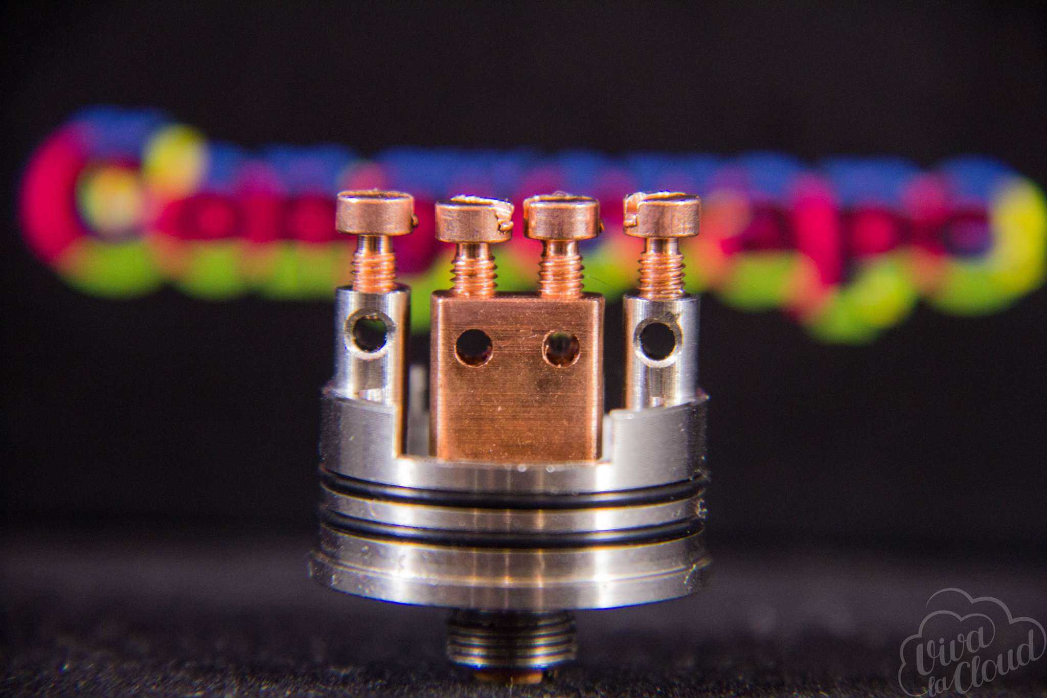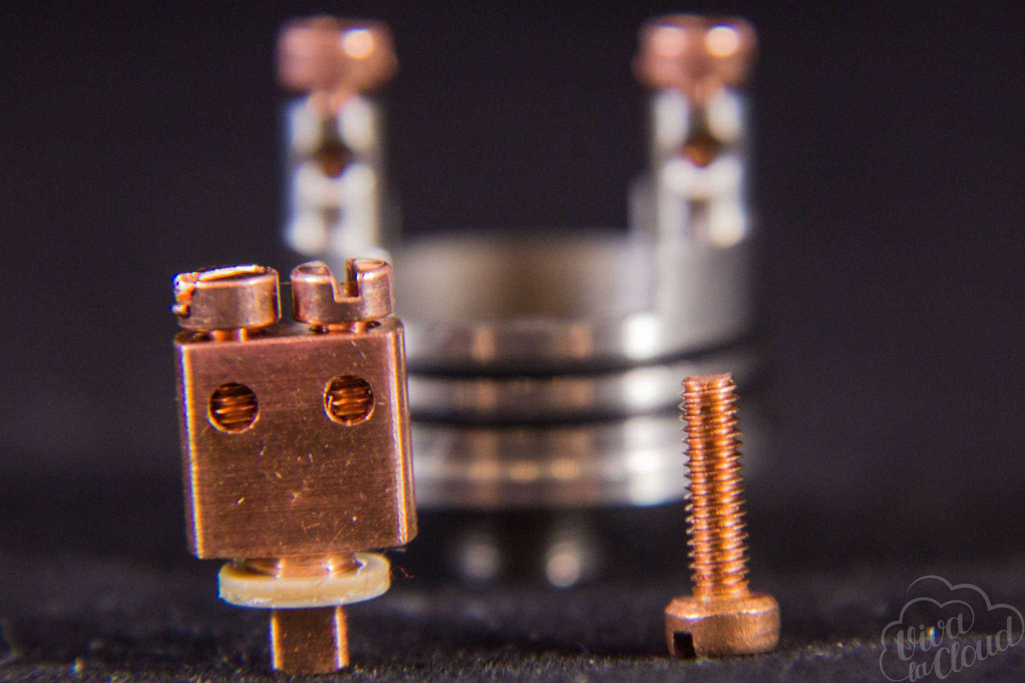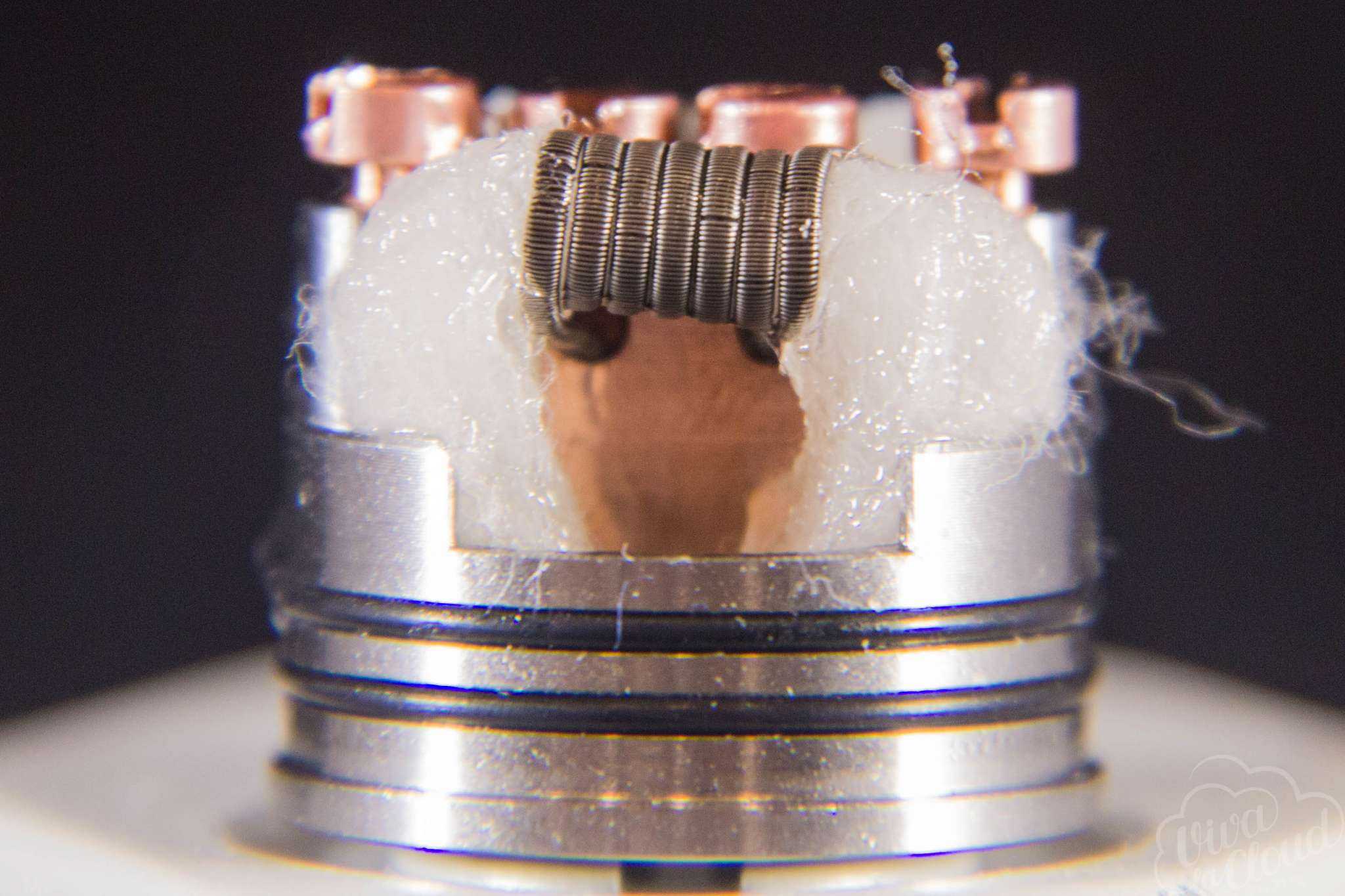 Изначально в базе уставлена массивная раздвоенная стойка из меди, которая должна снизить внутренние просадки RDA. Отверстия для установки спиралей имеют диаметр 2,2 мм каждая.