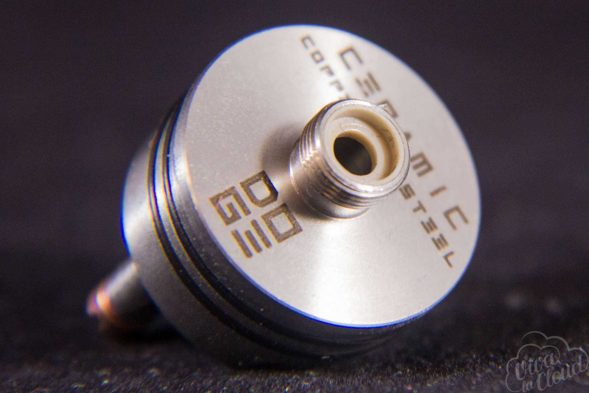 Дрип-топ здесь выполнен из карамики. Мы специально решили пожертвовать своими легкими и жидкостью и потестировать его теплоизоляционные свойства на мощности в 200 Ватт.