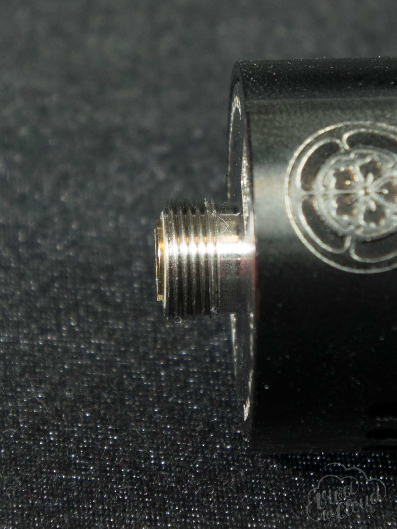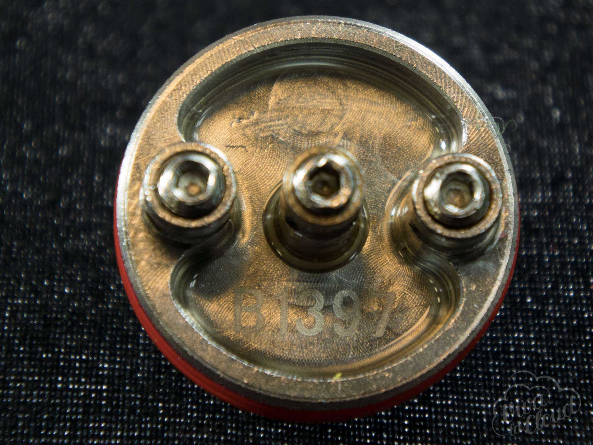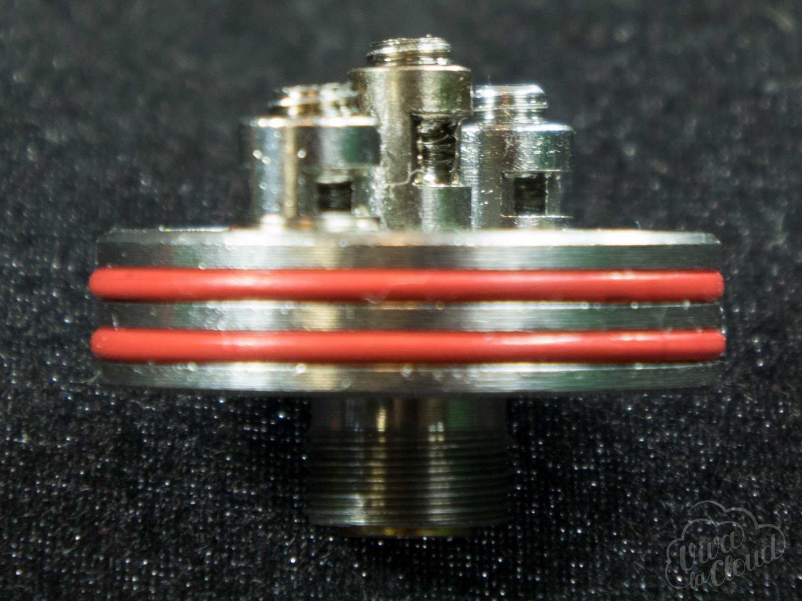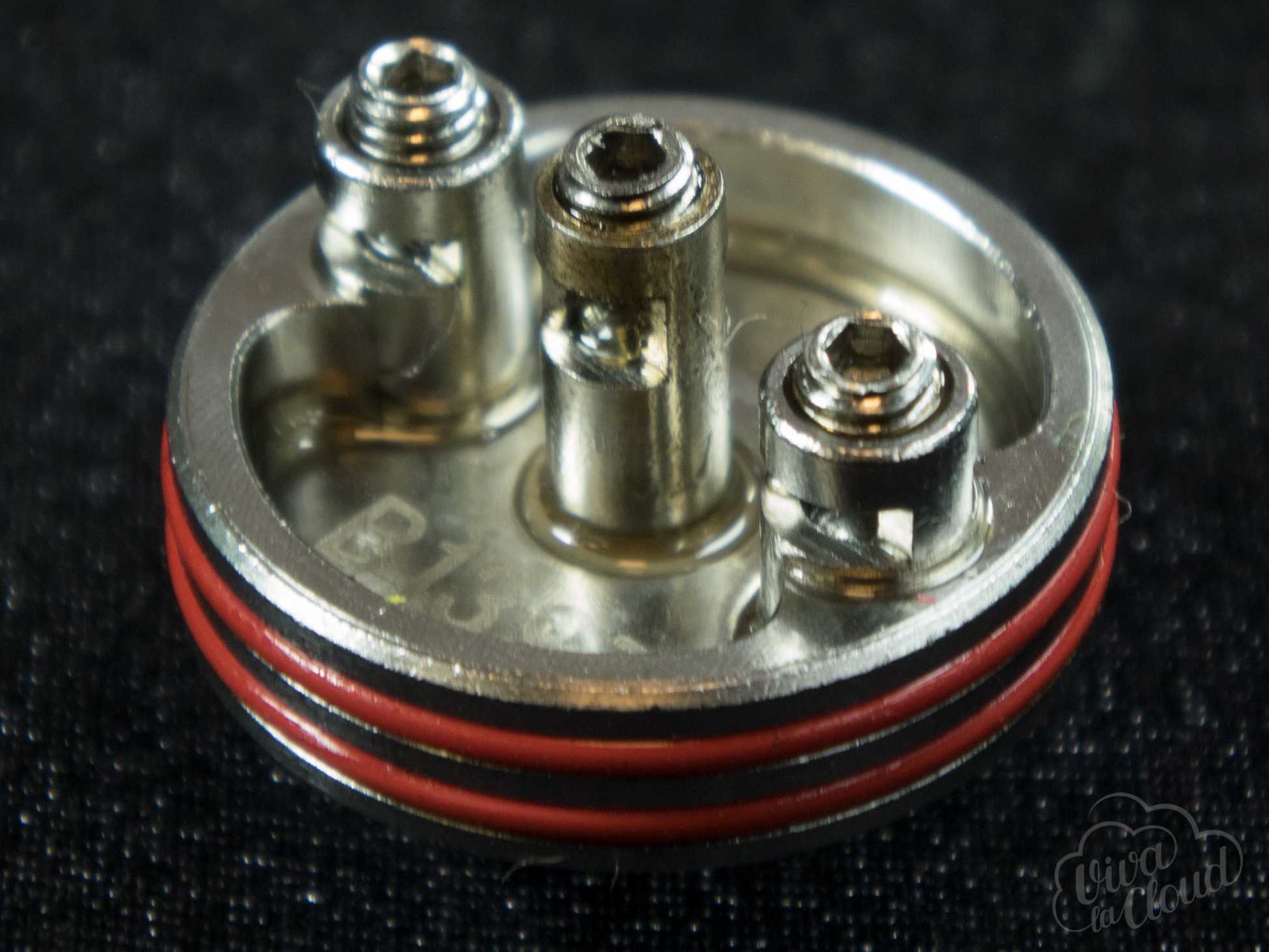 Формат базы стандартный — 3 стойки, но отверстия сделаны прямоугольным вырезом для большего удобства установки намоток. Особенно удобно ставить плоский кантал, fused clapton, catterpillar coil. Фиксируется намотка шестигранными винтами с скругленным концом, что не закусит проволоку при излишних усилиях в намотке. Тело держится на двух о-рингах и сидит очень крепко.
