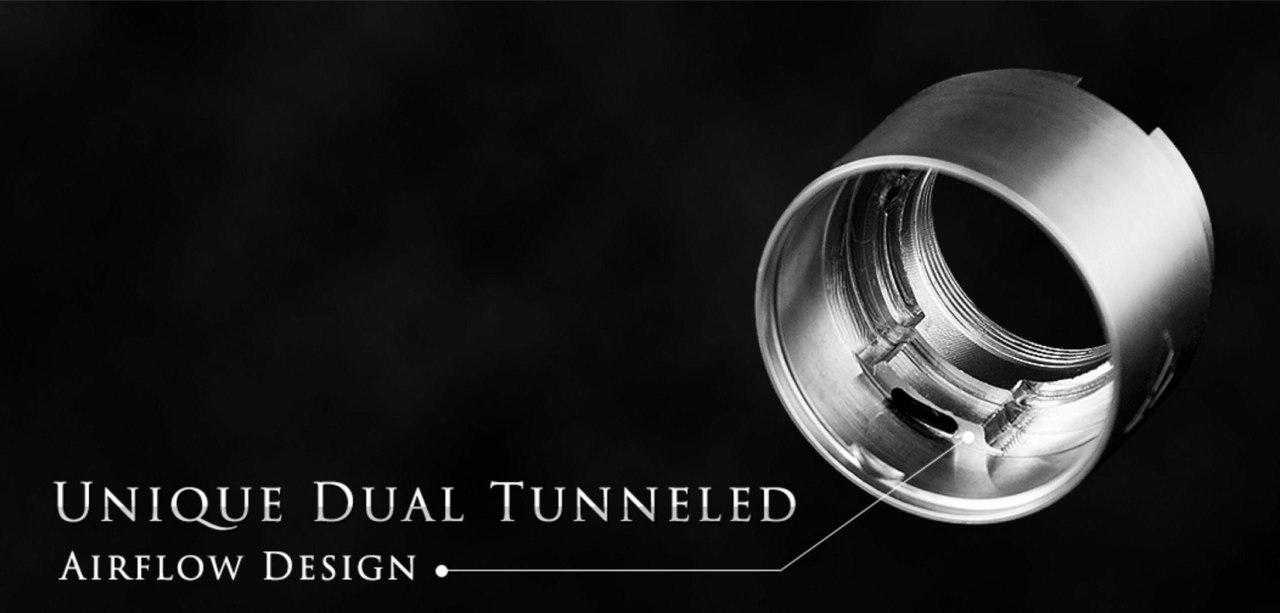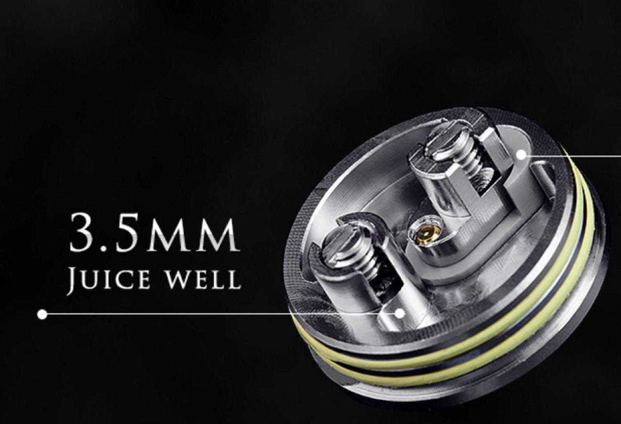 4 отверстия верхнего обдува для лучшего вкуса с регулировкой, 3,5 мм колодец для жидкости. Самое же главное тут в стойках — их две. Но что добавит вам слюней в карман, так это система установки спиралей. Здесь не отверстия в стойках, которые привычно многим, а полный вырез. То есть намотки Sleeper можно просто вставить уже готовые и просто прижать винтами. Мы долго ждали достойной реализации этой идеи.