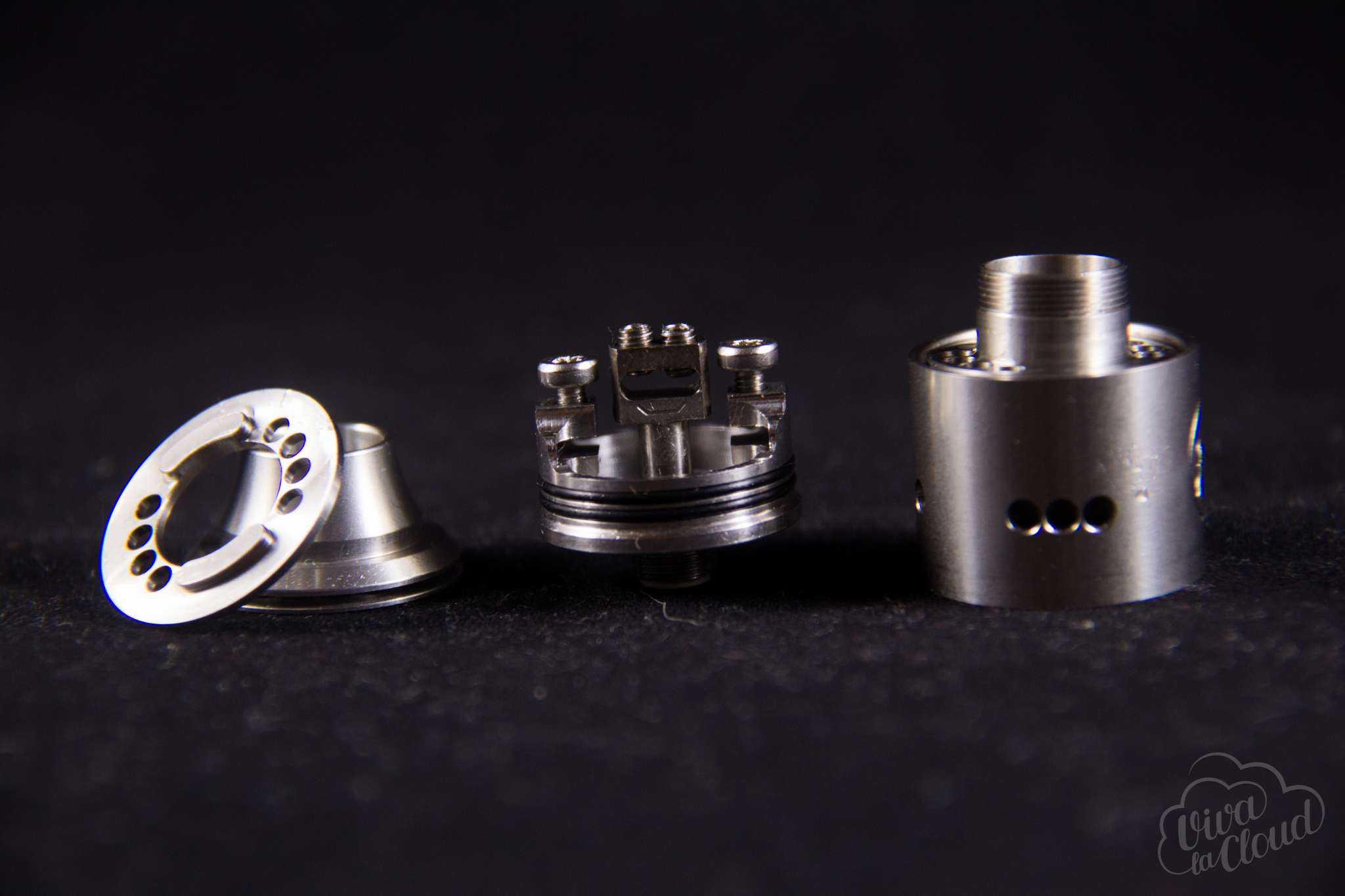 В RDA присутствует верхний обдув. Он регулируется при помощи кольца, которое прижимается дрип-топом к юбке. Как в дрипке, так и в кольце есть четыре отверстия и совмещая их, мы получаем плохой вкус и очень много воздуха.
