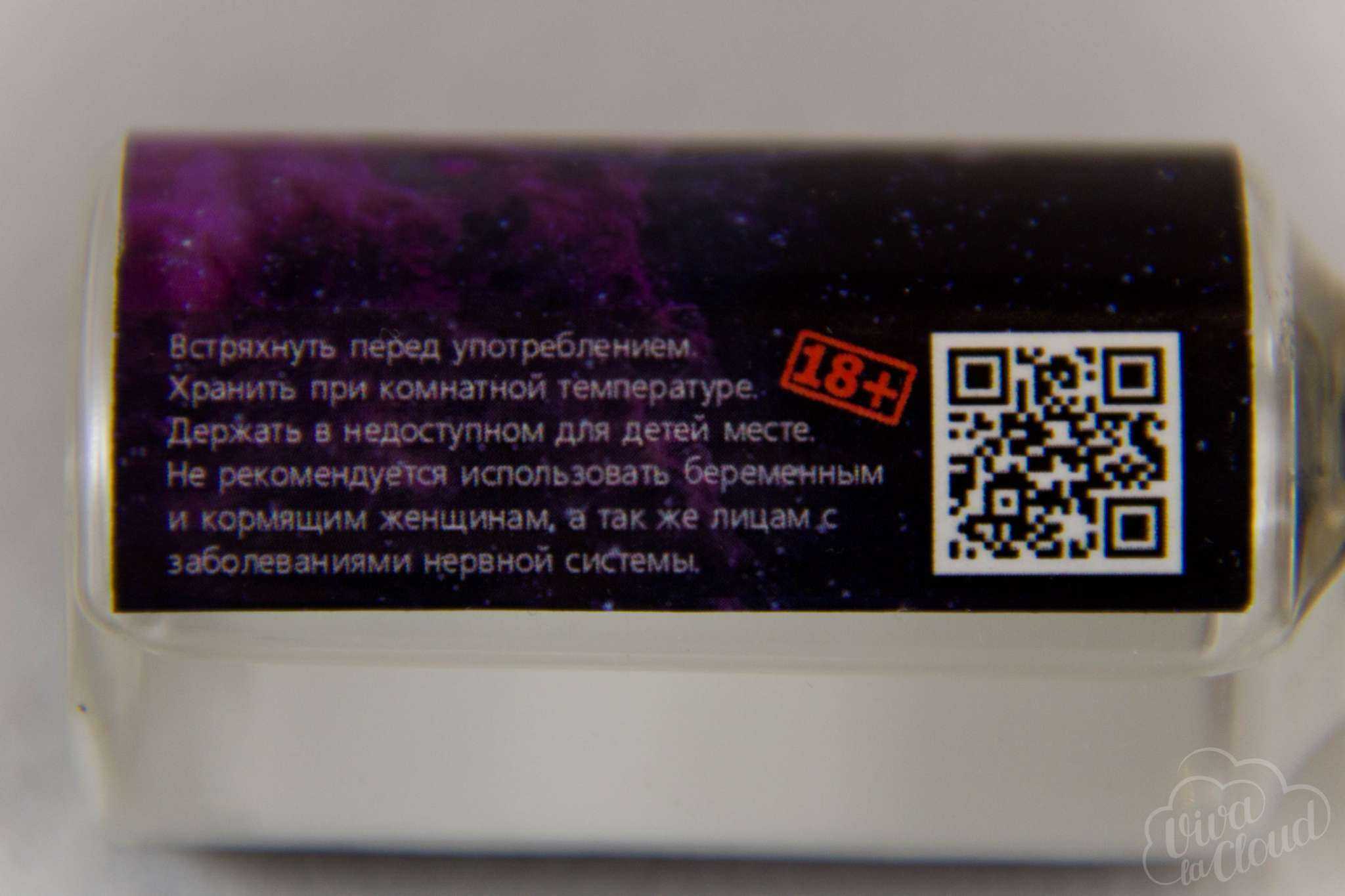 Состав, название, объем, маркировка «18+», а также все предупреждения присутствуют. Крепость обозначается точкой маркера в одном из четырех «окошек»: 0, 1.5, 3 или 6 мг. Есть и название группы производителя «ВКонтакте», а также QR-код, по которому можно сразу же в нее перейти — удобно.