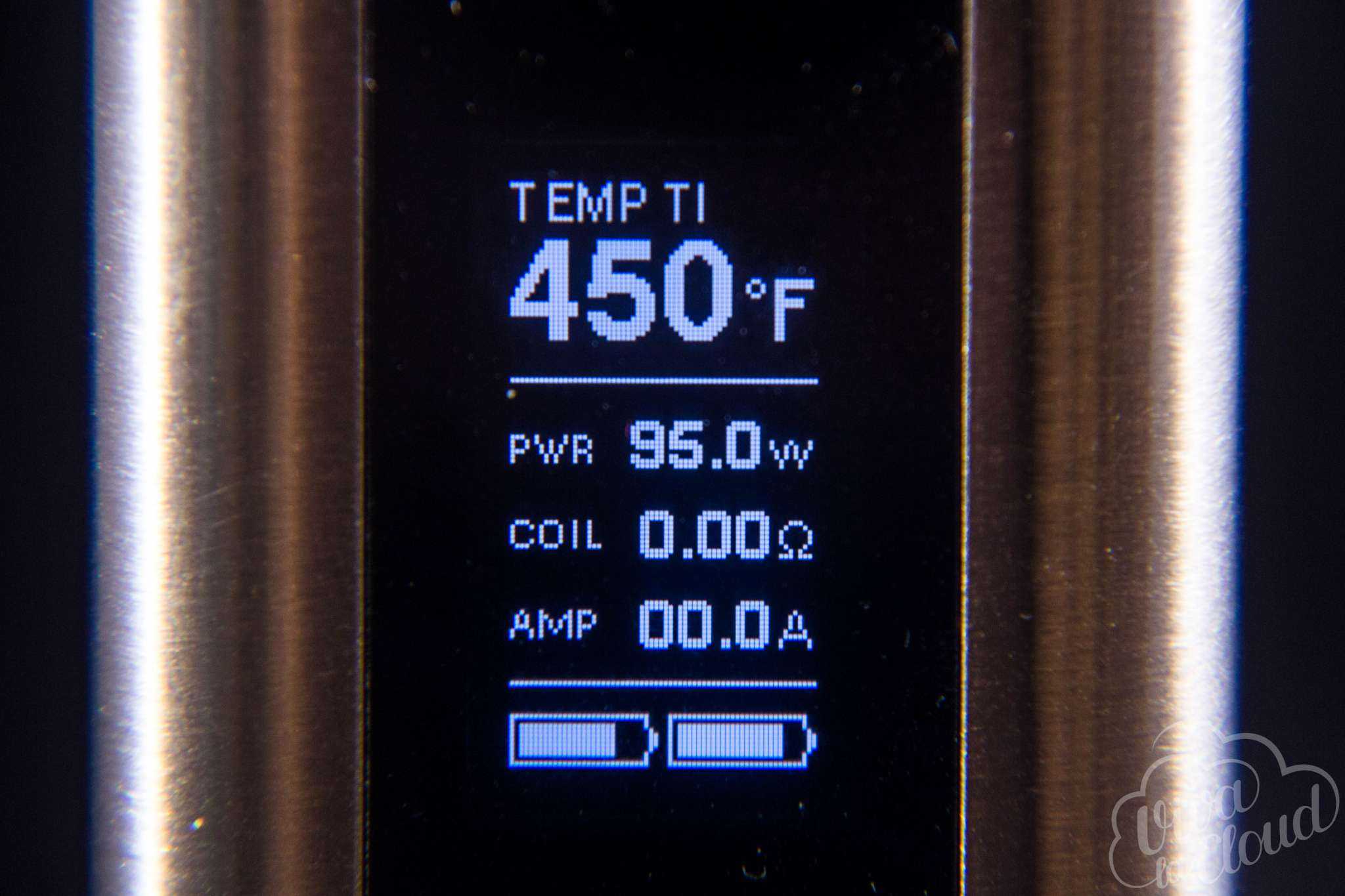 На экране отображается вся важная информация: текущая мощность, напряжение, сопротивление атомайзера, количество затяжек и заряд двух аккумуляторов по отдельности.