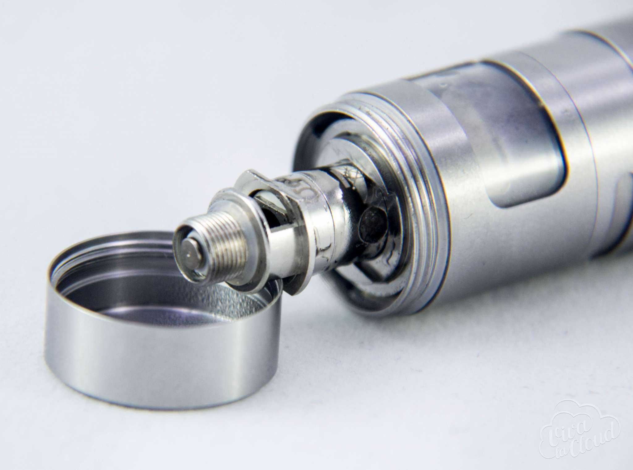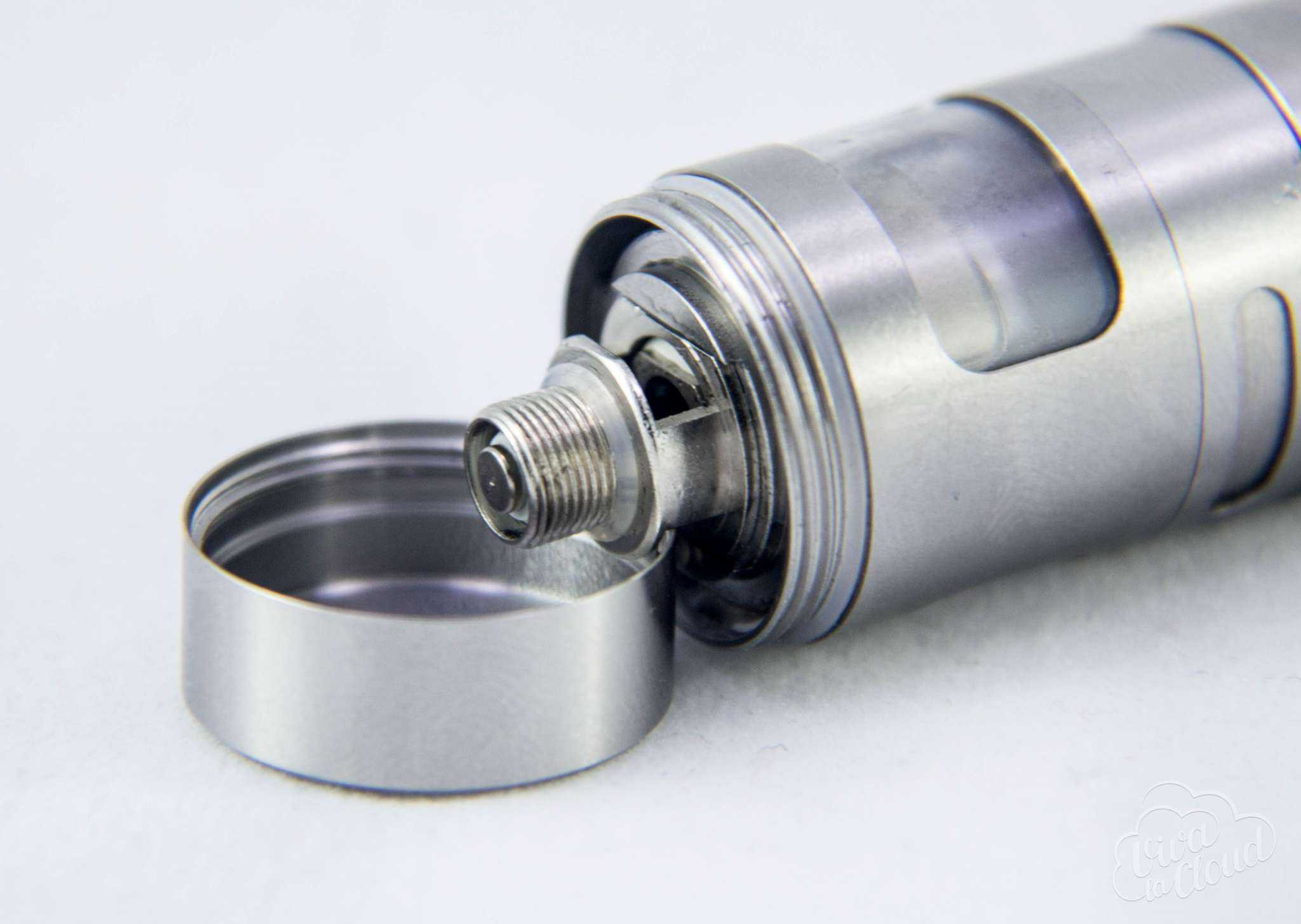 iSub Apex практически неразборный, и это не очень, потому что нельзя его полноценно промыть. Снимается только нижняя часть для замены испарителей. Меняются они довольно просто: вынимаем испаритель из основного тела бака и всё. Любопытно, что он одновременно является еще и частью коннектора. Пин, кстати, почти не выступает, поэтому использовать данный бак на гибридных механических модах нельзя.