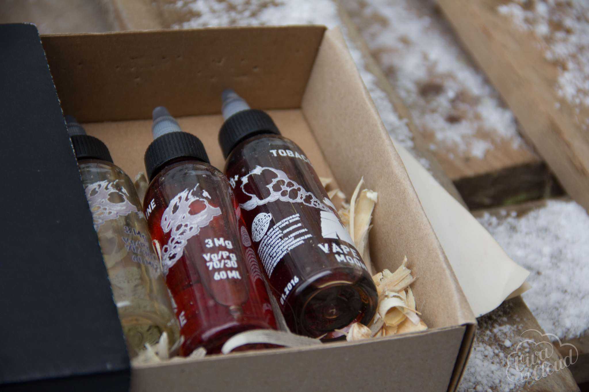 К нам вся линейка пришла в картонной черной коробке с большим логотипом. Внутри в деревянных опилках расположились сами жидкости, а также очень круто выполненная брошюра с информацией о всей линейке, стилизованная под помятую листовку.