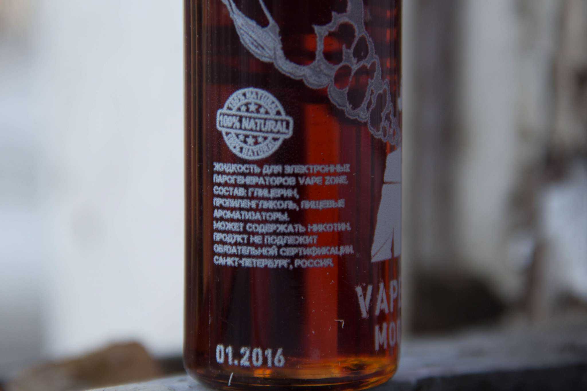 Этикетки детально проработаны и абсолютно не стираются. Здесь используется текстурная печать — все надписи и логотип можно почувствовать собственными пальцами. Написан вкус, крепость, баланс PG/VG, объем, а также состав и предупреждение, что данный товар может содержать никотин и место производства — Санкт-Петербург. Есть и две маркировки: «18+» и “100% natural”.