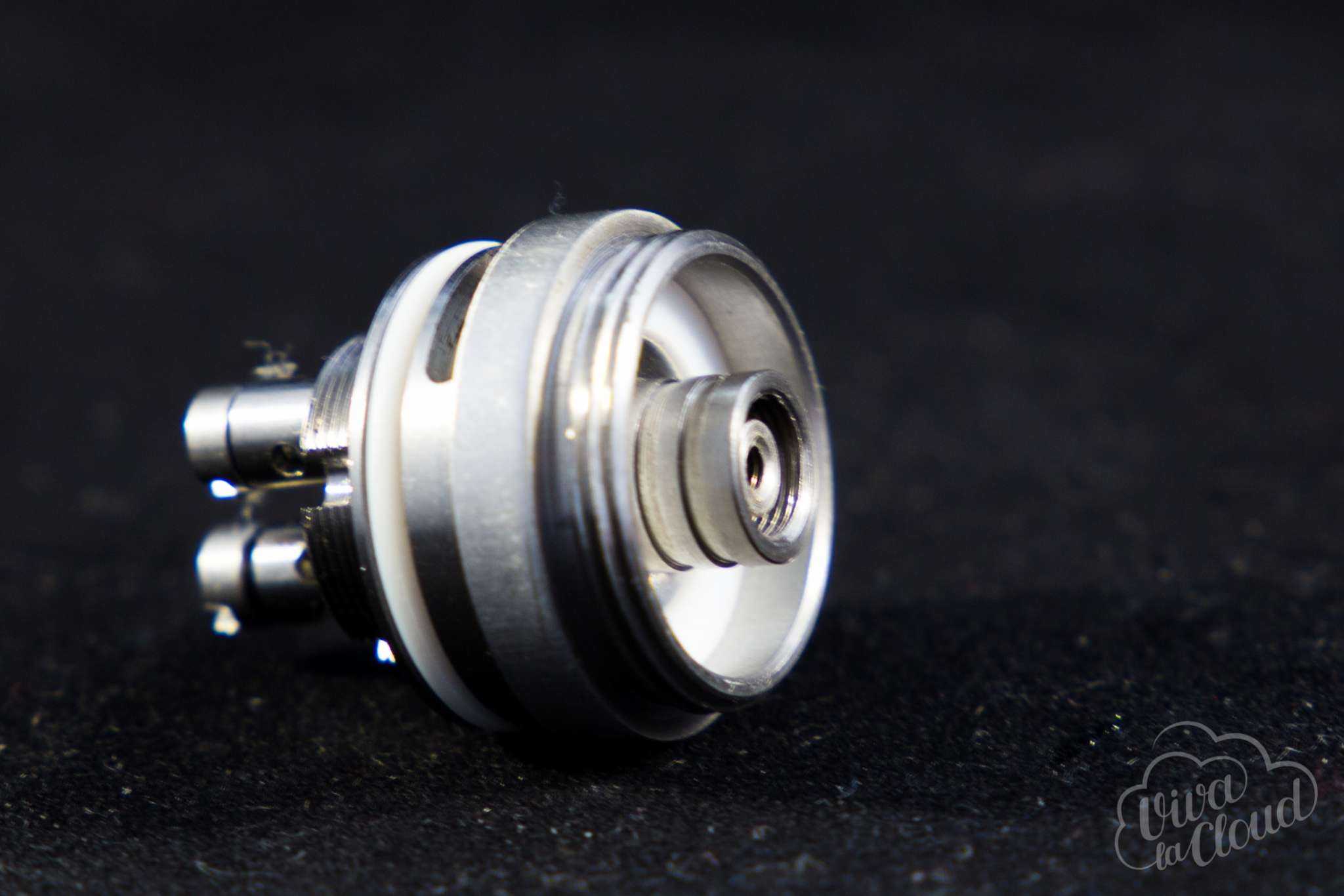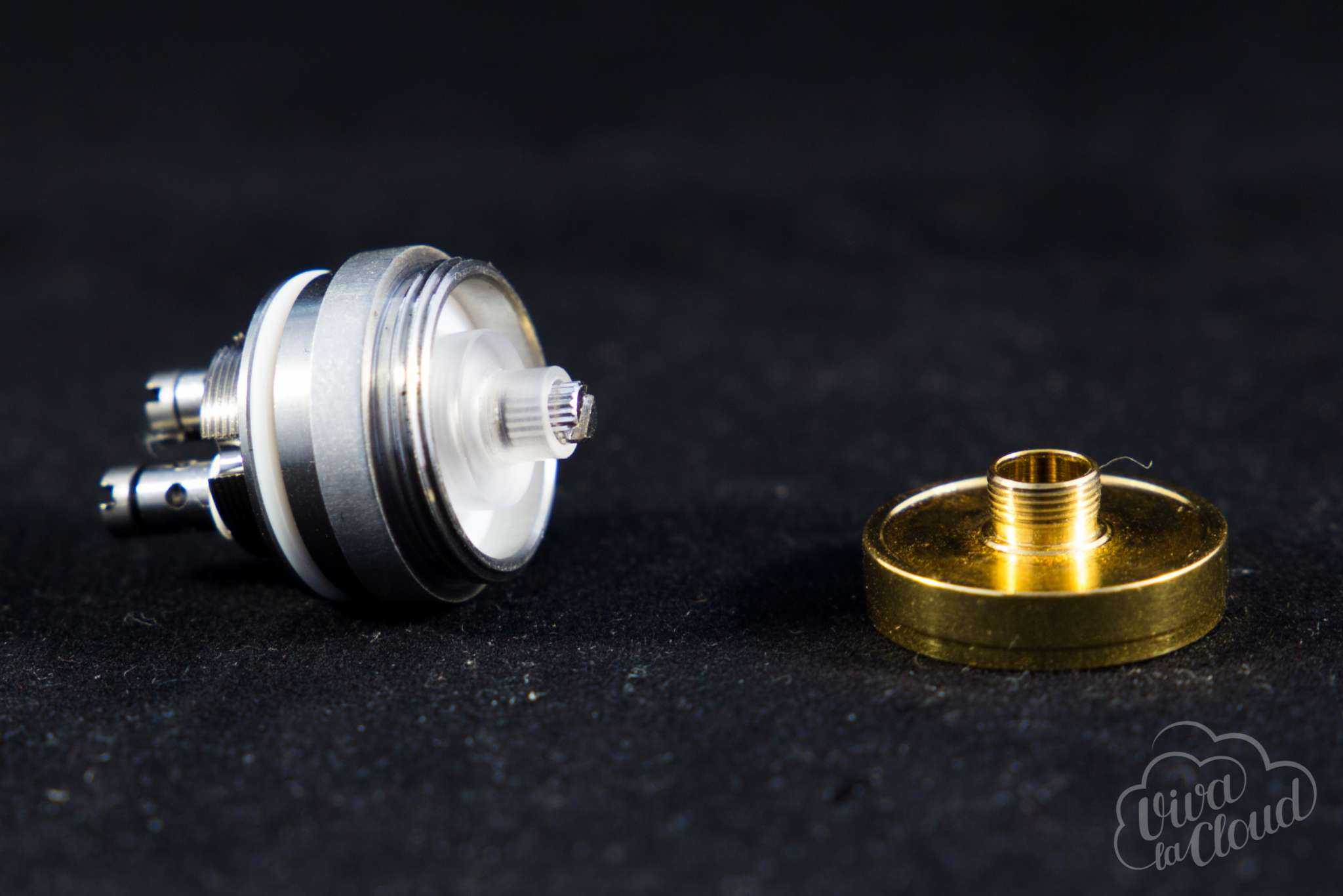 От базы тут буквально «пахнет старыми книжками». Ну, серьезно, мы очень давно не видели разноуровневые стойки. Придумано такое решение для односпиральных атомайзеров, а в этом случае, чтобы воспользоваться этим удобством, придется мотать спирали в разные стороны — витки от себя на одном койле и на себя на другом.