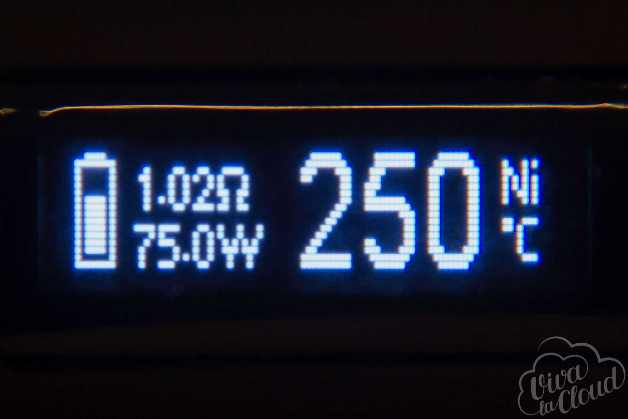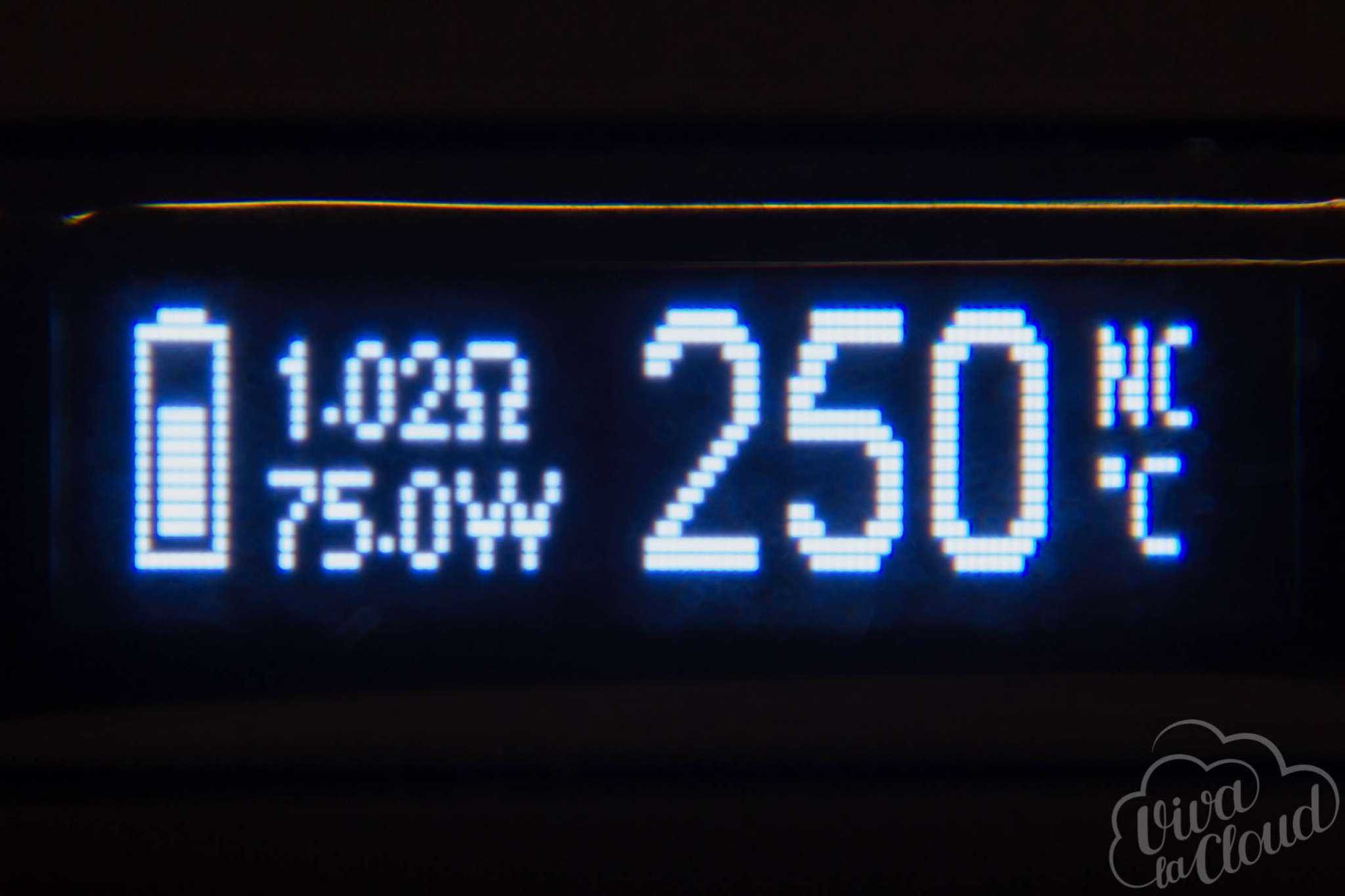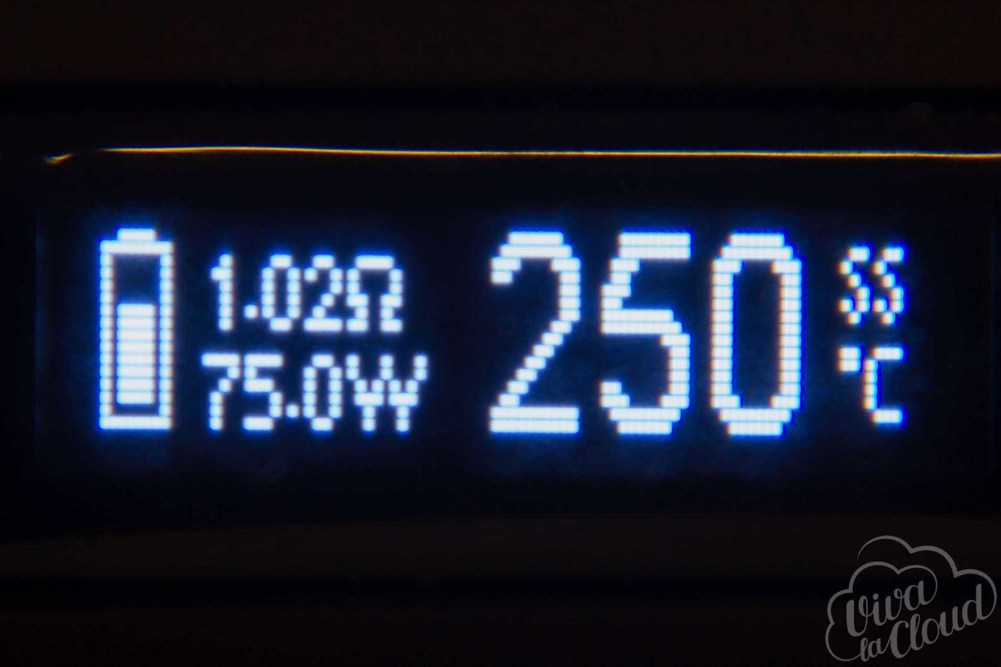 На экране отображается текущая мощность, сопротивление, индикатор заряда батареи и напряжение, которое показывается во время затяжки.