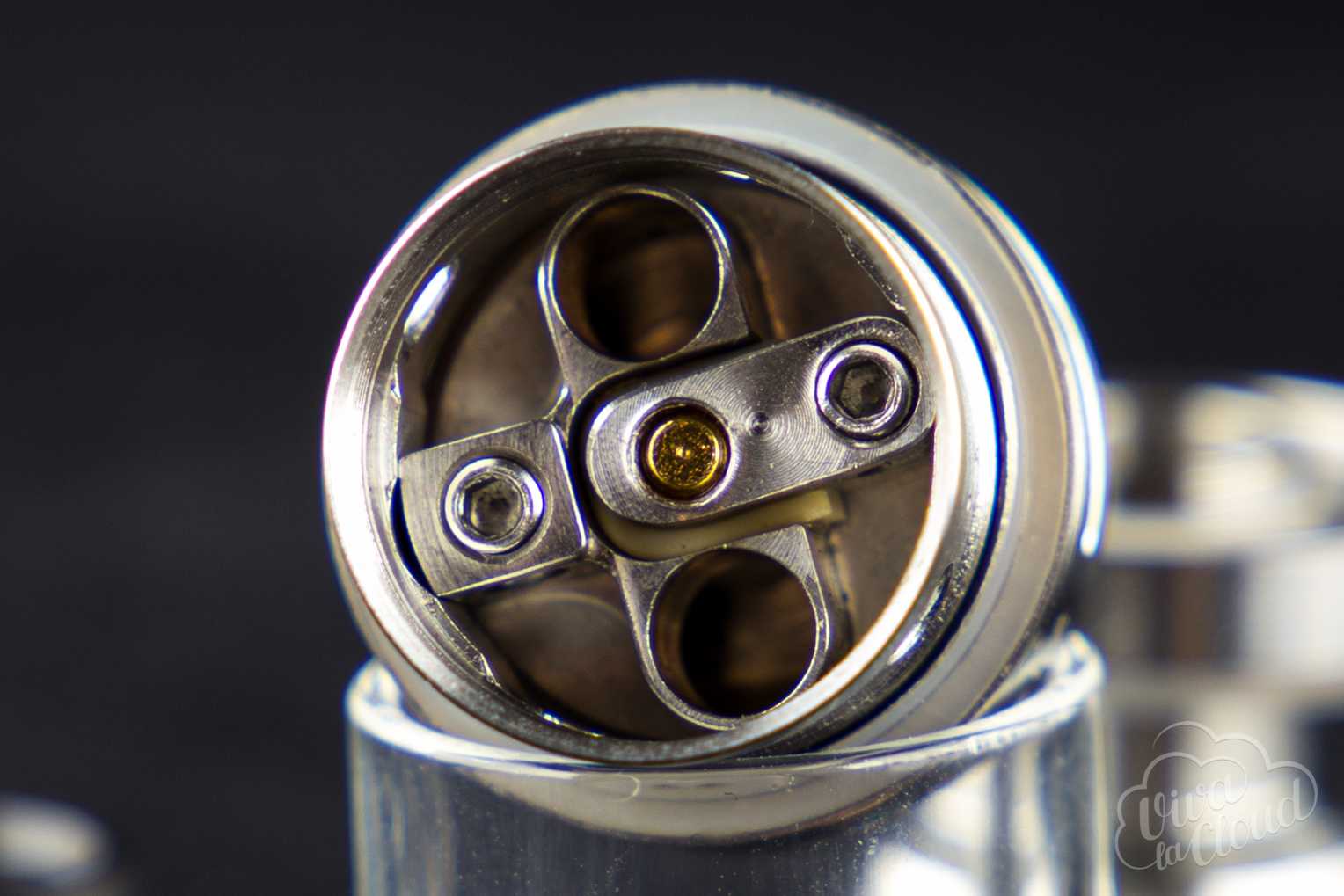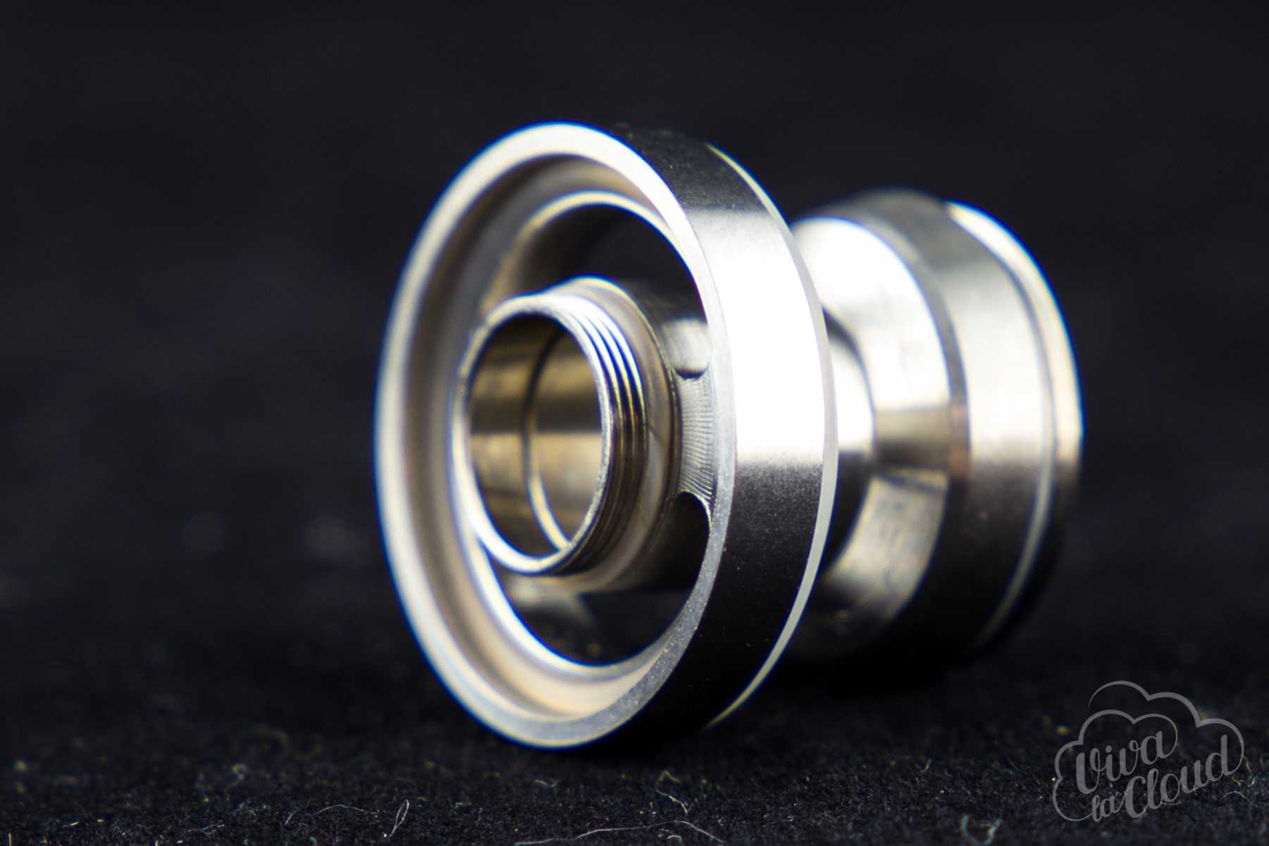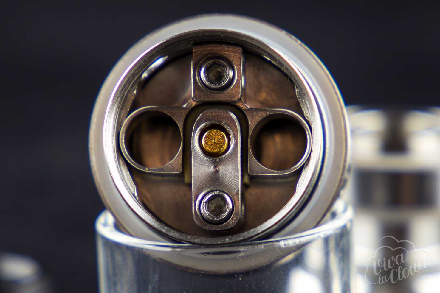 База скорее похожа на базу от дрипки, чем от бака. Здесь нет проточек для подачи жидкости, а дека — тонкий блинчик из металла с бортиками вокруг гигантских отверстий обдува и торчащим снизу позолоченным пином. Тут, наверное, можно было назвать калибр, но их диаметр равен 4 мм. Отверстия в стойках расположены неровно и чуть ниже верхних граней бортиков, что добавляет немного боли при перемотке. При желании пин можно выкрутить и полапать PEEK-изолятор.