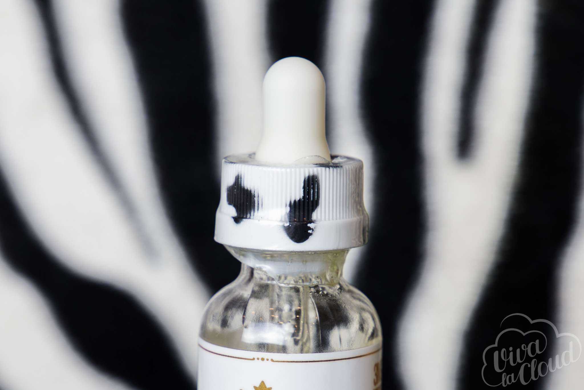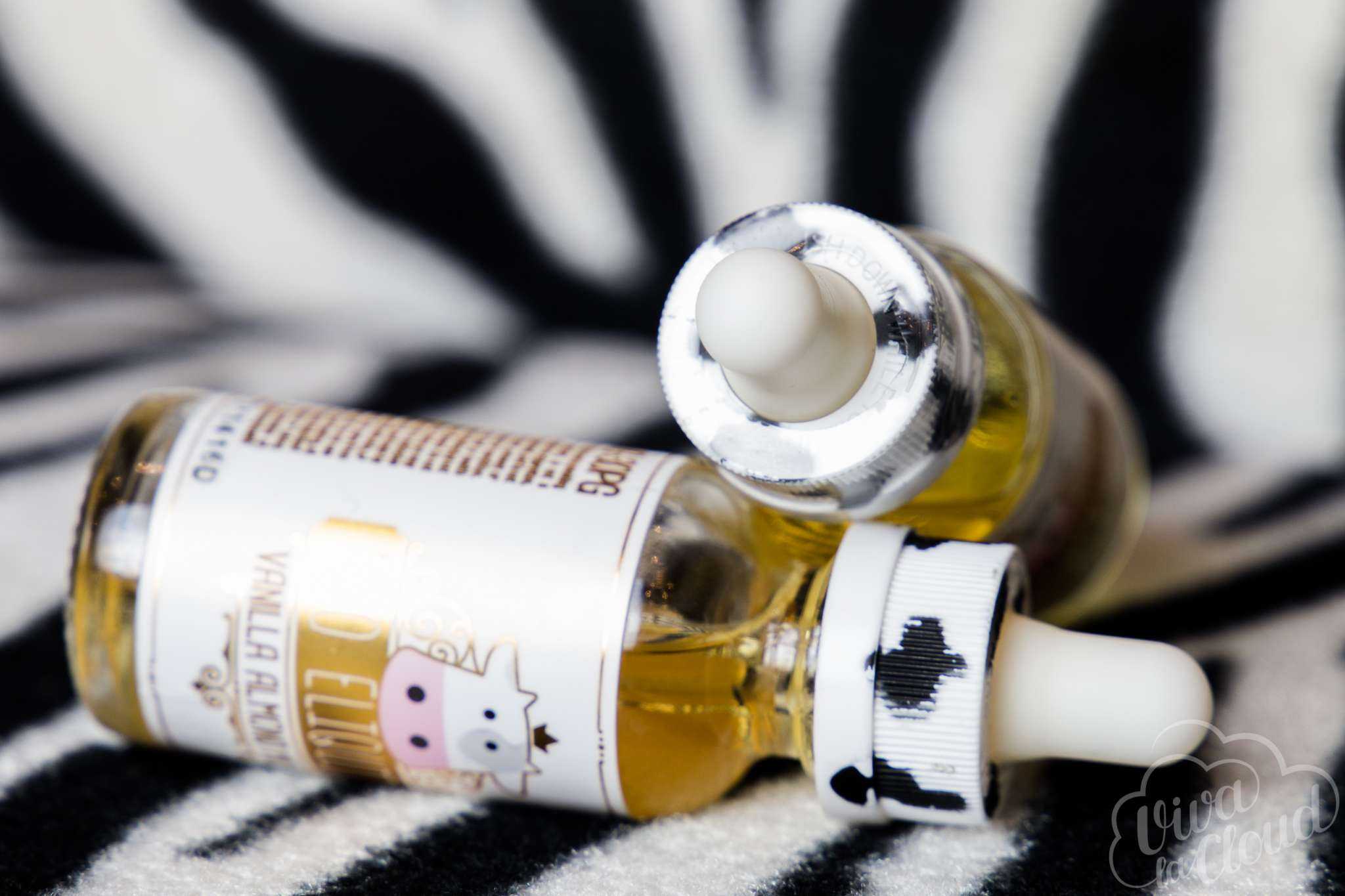 Итак, перед нами самый настоящий оригинальный подход к оформлению бутыльков. В особенности к пипеткам, которые окрашены под стиль коровы. Весьма подходит под тематику. Этикетка тоже оформлена в цвет с жидкостью – она желто-золотого цвета. И как же без няшной морды коровы? Она тут как тут.