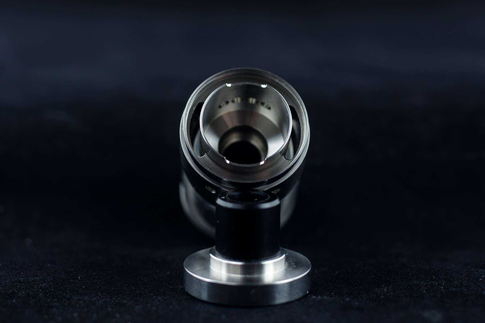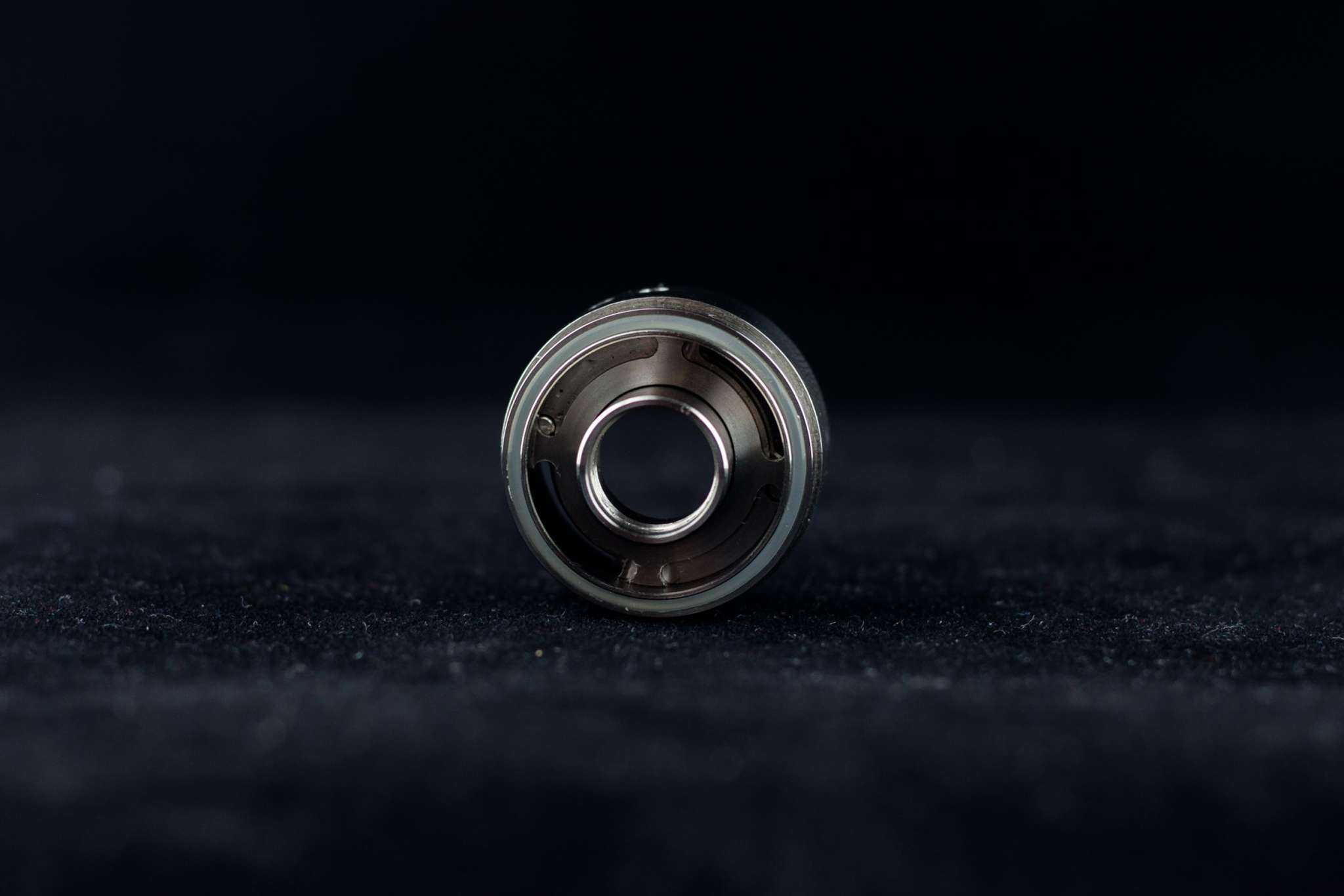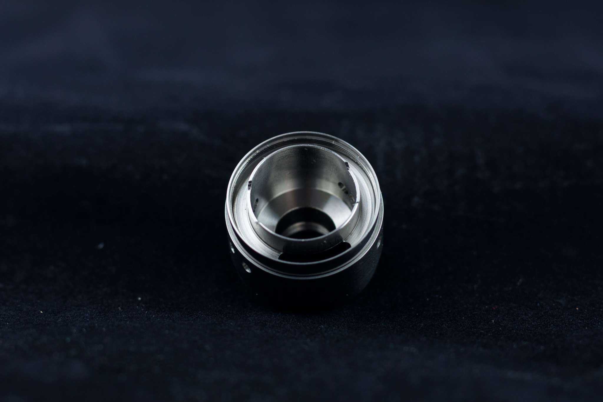 Испарительная камера огромная по баковым меркам. Её диаметр равен 17 мм, сферической обработки не имеет. Снизу в испарительную камеру вставляется база, направление койлов на обдув фиксируется пазами, фаски на них минимальные, и о-ринг, уплотняющий базу, часто закусывается, что приводит к его разрыву. Запасной о-ринг в комплекте, к счастью, имеется. Фиксируется эта конструкция кольцом, накручивающимся на тело бака.