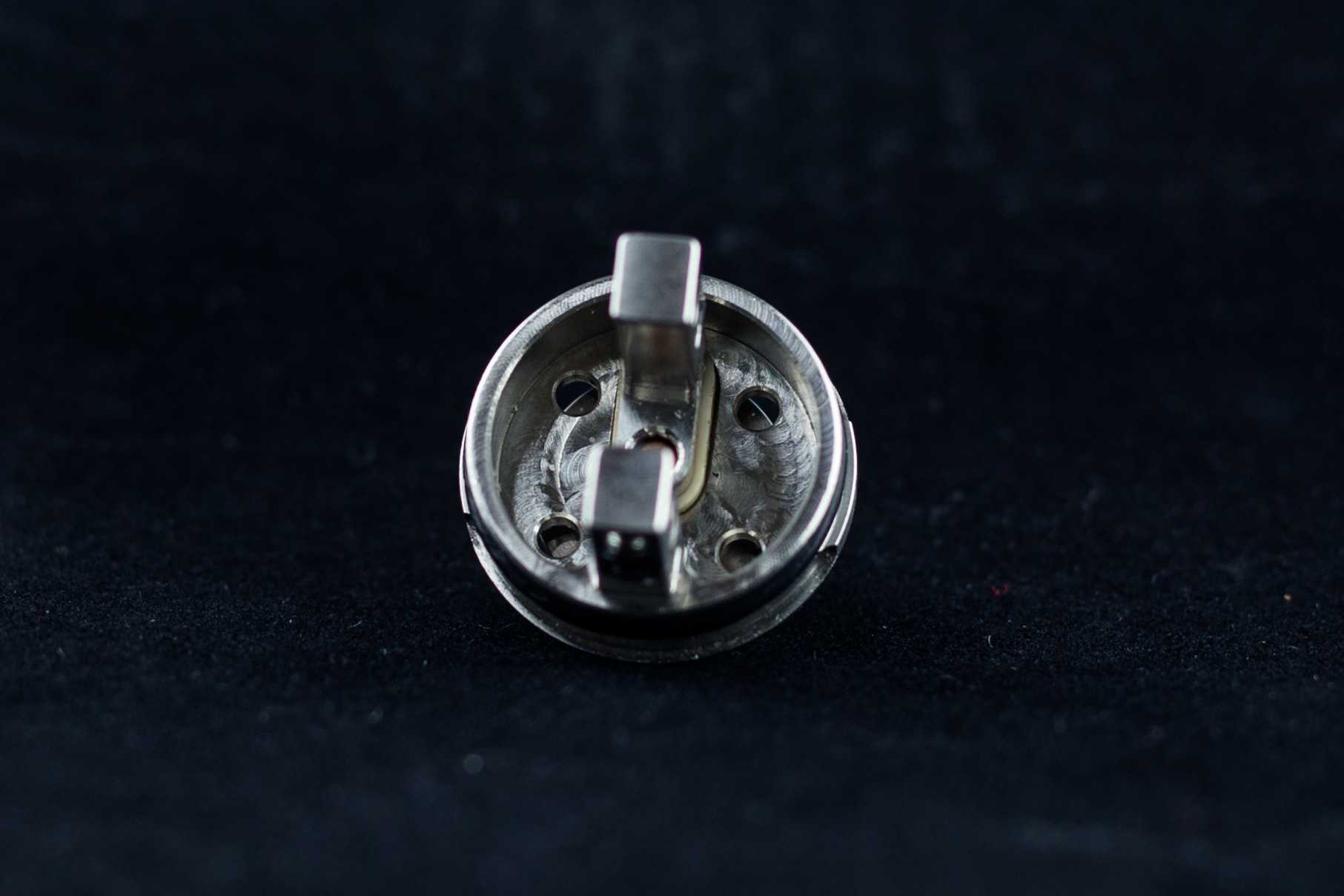 Кстати, в комплекте имеется аж две базы: первая имеет отверстия подачи 2 мм для парения жидкостей <60% VG на мощностях до 70-80 ватт, а вторая — с отверстиями 2.5 мм для больших мощностей и максимально глицериновых жидкостей. Одна из баз (с диаметром отверстий 2 мм) оказалась со слегка наклоненной плюсовой стойкой — мелочь, но слегка напрягает.