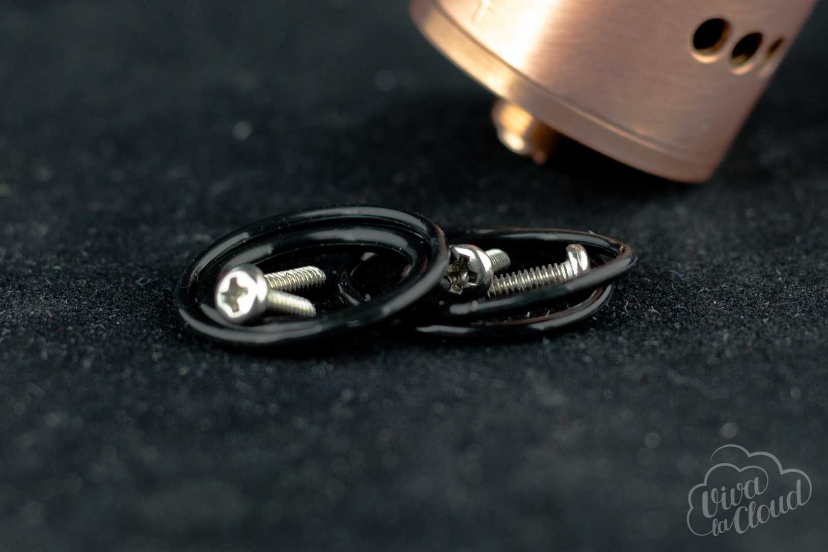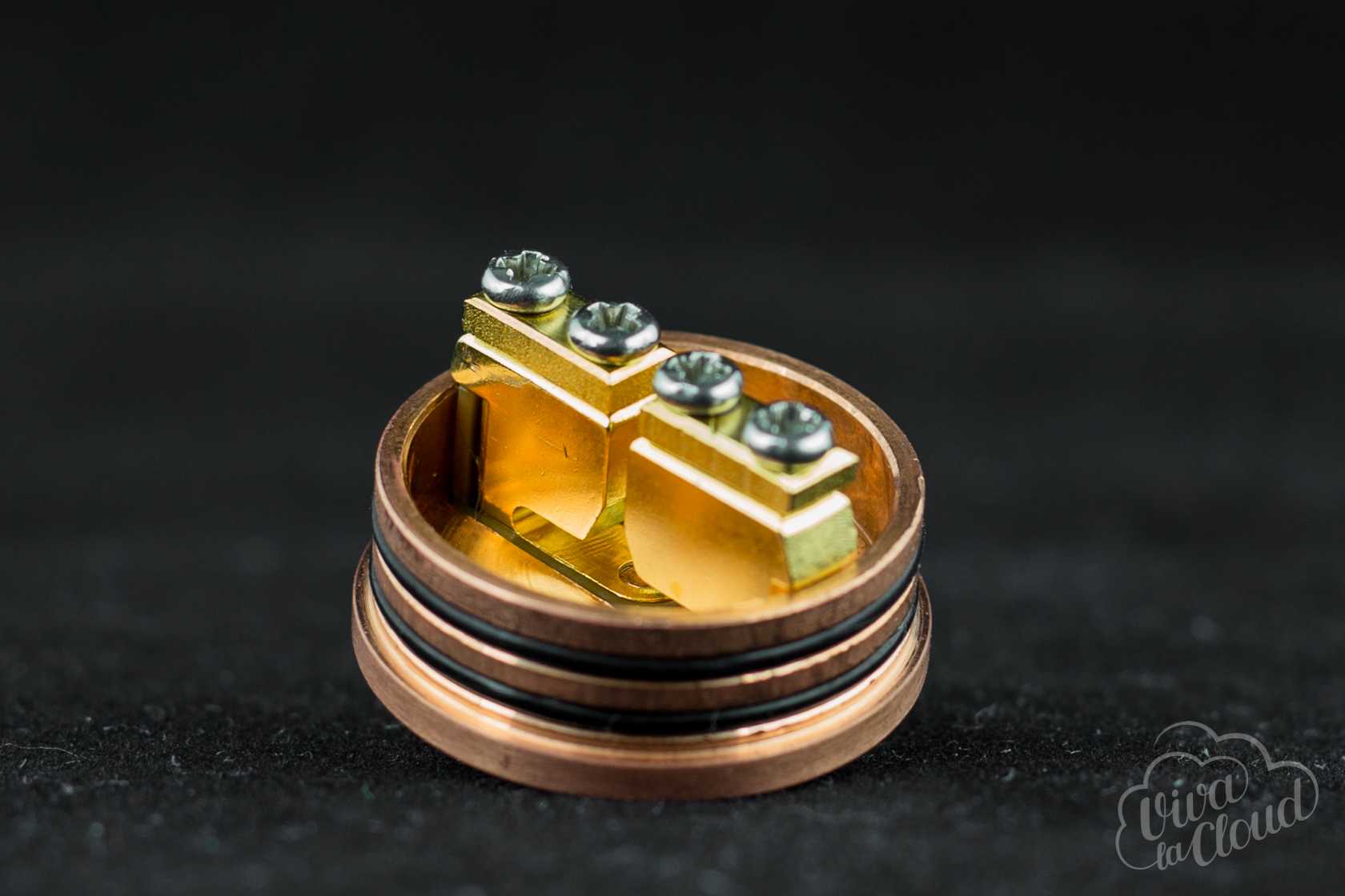 Goon RDA — это первая дрипка с прижимным типом стоек. Это решение показалось нам очень верным по двум причинам. Во-первых, при установке просто невозможно перекусить спираль, так как прижимные пластины плоские. Во-вторых, можно установить буквально любую намотку.