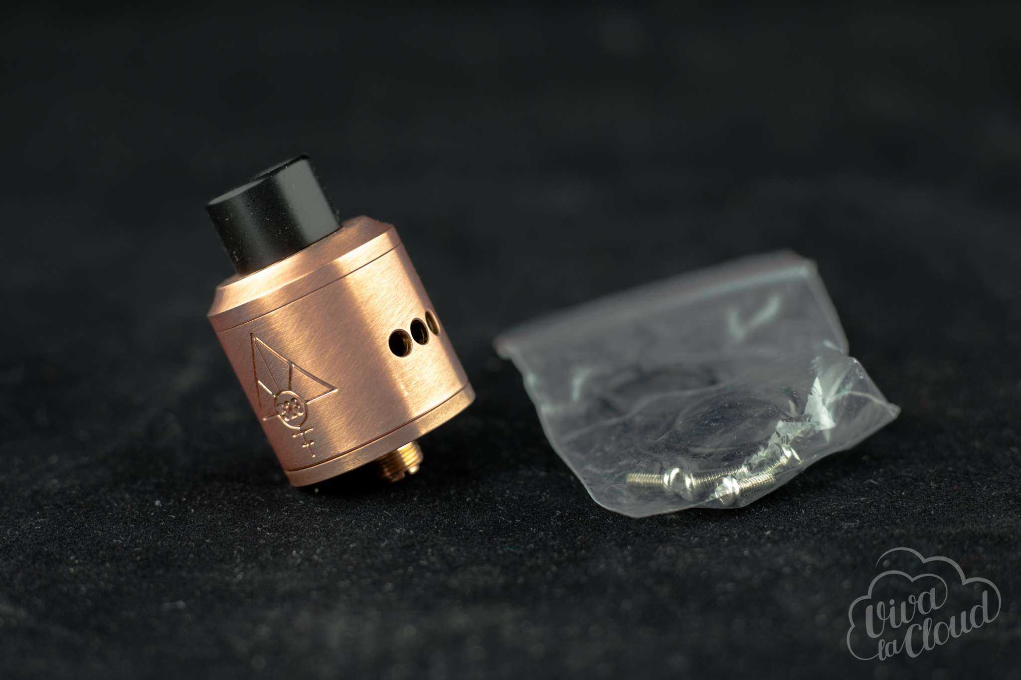 Диаметр в 24 мм вкупе с прижимными стойками действительно дают разыграться воображению. Советуем ставить койлы помассивней. Мы использовали Goon RDA с намоткой Alien: 3 отрезка из 0,4 нихрома внутри и 0,2 сверху, 4 витка на 3 мм. Вкус просто невероятный.