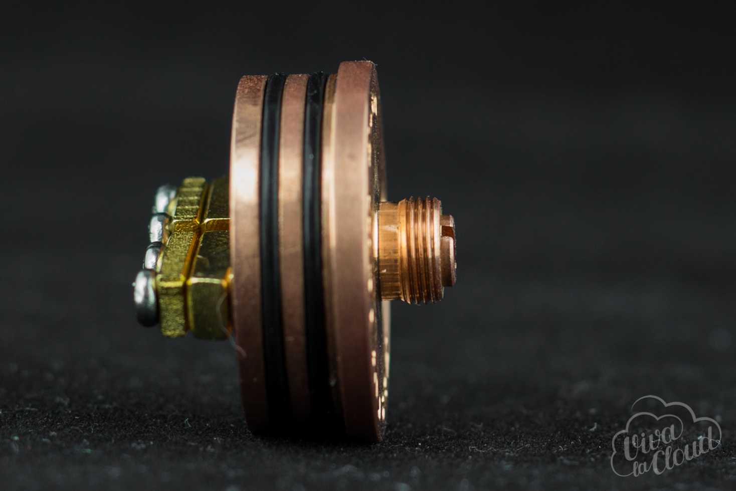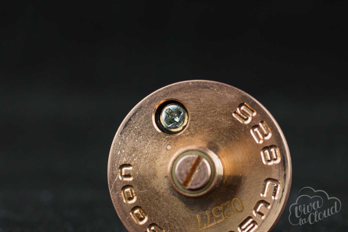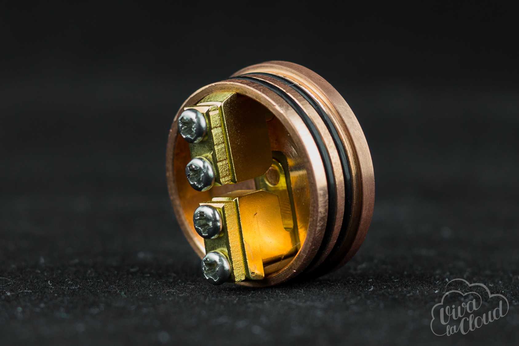 Пин у Goon’а медный, выступает он достаточно для использования дрипки с гибридными механическими модами. Также есть дополнительный винт, который позволяет подтянуть минусовую стойку, а при желании разобрать ее или заменить на новую.