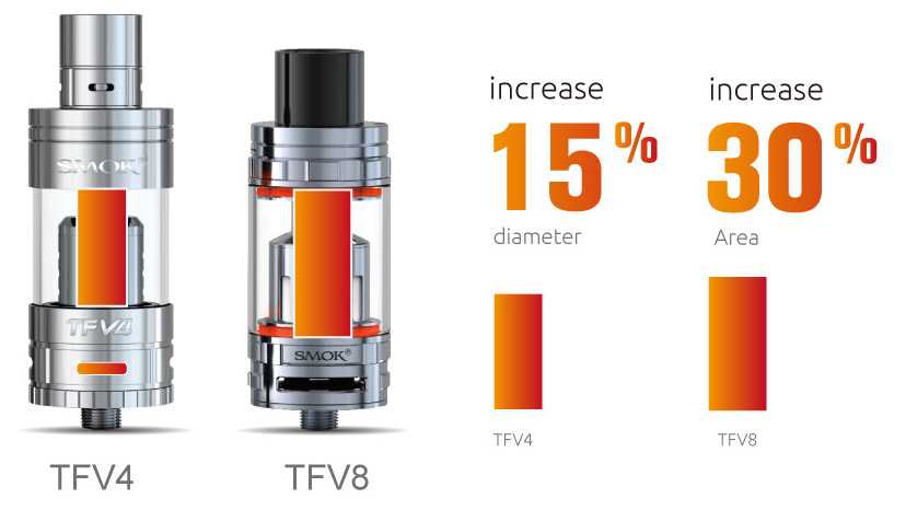 Если отбросить горы ярких рекламных картинок, то можно увидеть суть. TFV «потолстел», теперь его диаметр составляет 24.5 мм, а емкость — аж 6 мл. Отверстия обдува увеличились на 18%. Шахту тоже сделали больше, дрип-тип стал шире и выполнен из делрина. К счастью, увеличилось и заправочное отверстие, доступ к которому осуществляется по той же схеме сдвигающейся в сторону крышки.