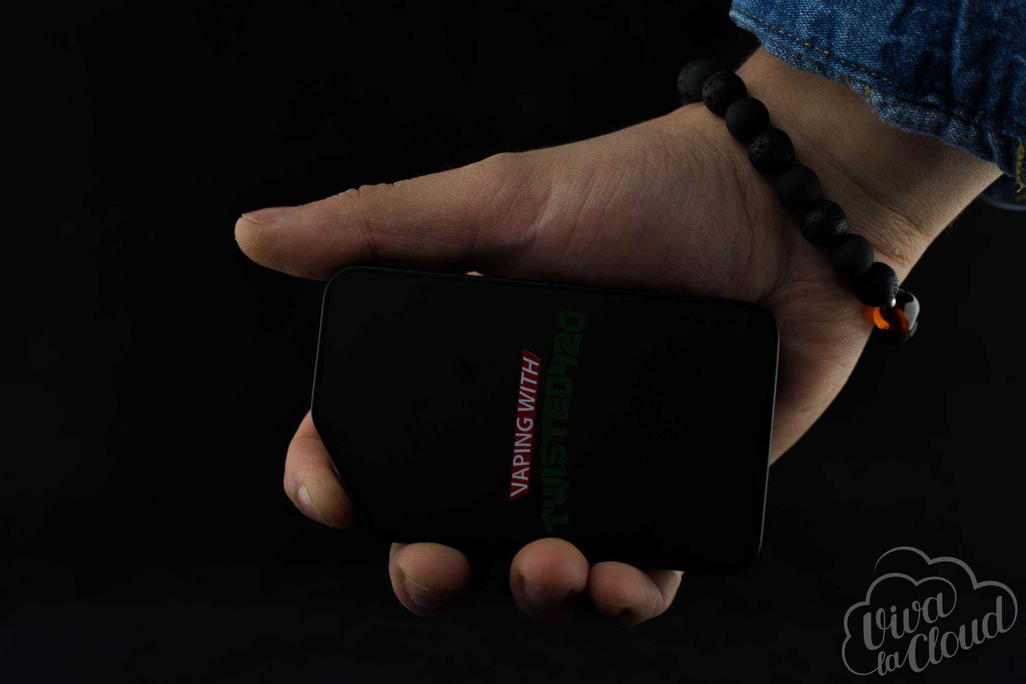 К нам на обзор приехал боксмод черного цвета. Также, как и на коробке, с одной стороны изображено название устройства, а на другой — логотип Vapingwithtwisted420. Покрытие матовое и похоже на софт-тач пластик.