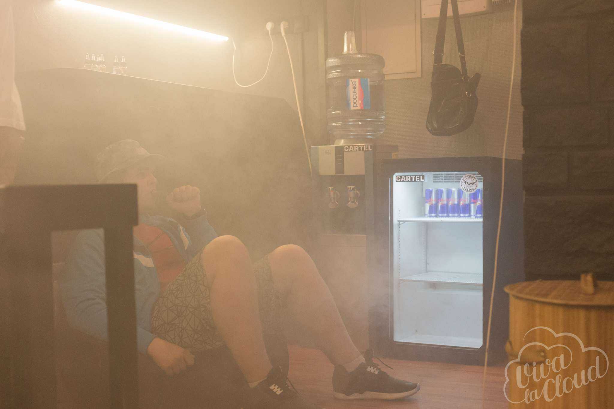В Cloud Cartel две зоны для отдыха. Одна находится слева от входа — это диван, где могут расположится два-три человека, пообщаться или подождать своей очереди перед барной стойкой.
