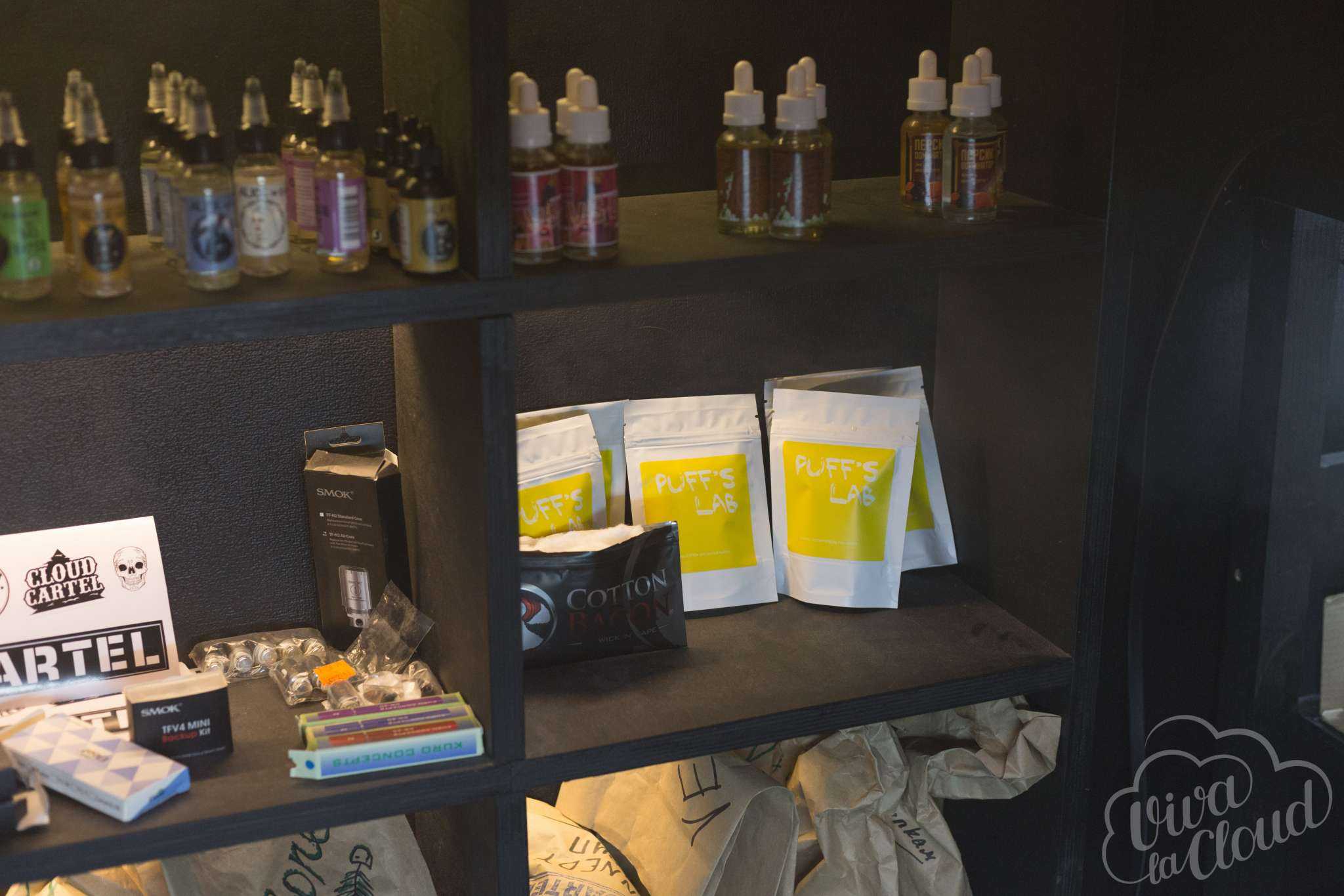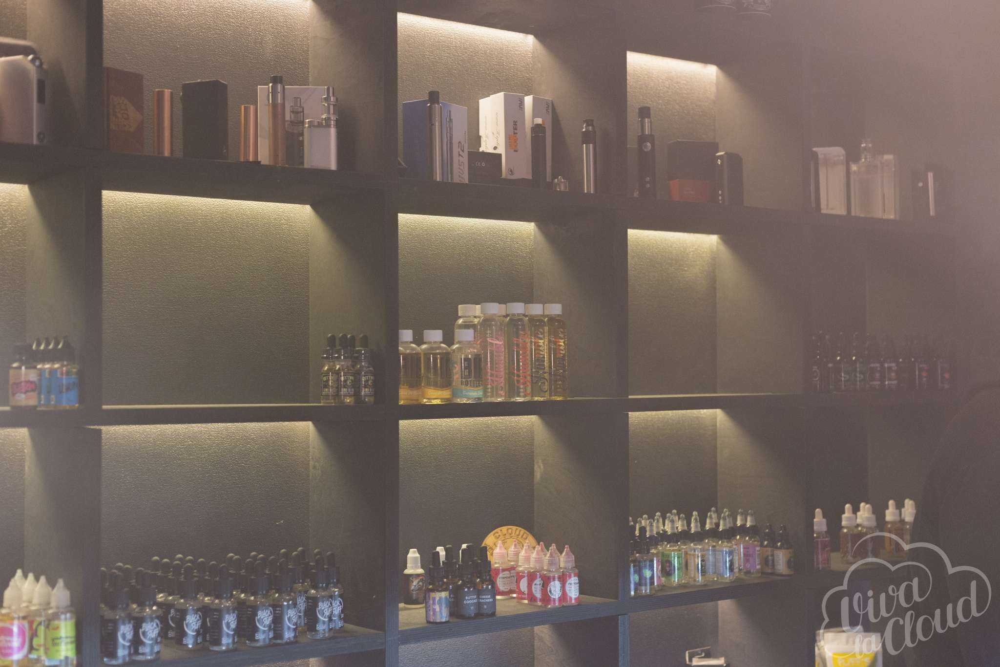 Весь арсенал располагается на полках за барной стойкой. Тут, кстати, неплохое зонирование — жидкости стоят на центральных полках и частично ниже. Также в двух «слотах» находятся все аксессуары и комплектующие по типу ваты, наклейки, проволоки, испарителей и другого.