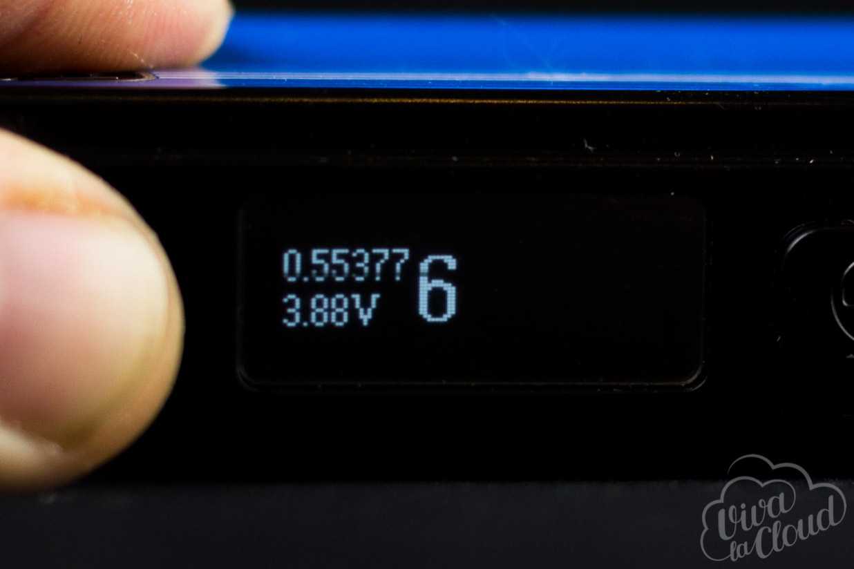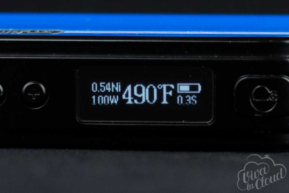 На дисплее присутствует вся необходимая информация: сопротивление атомайзера, напряжение, мощность или температура, индикатор заряда батареи и время текущей затяжки. Чтобы переключаться между режимами, нужно зажимать кнопки «плюс» и Fire.