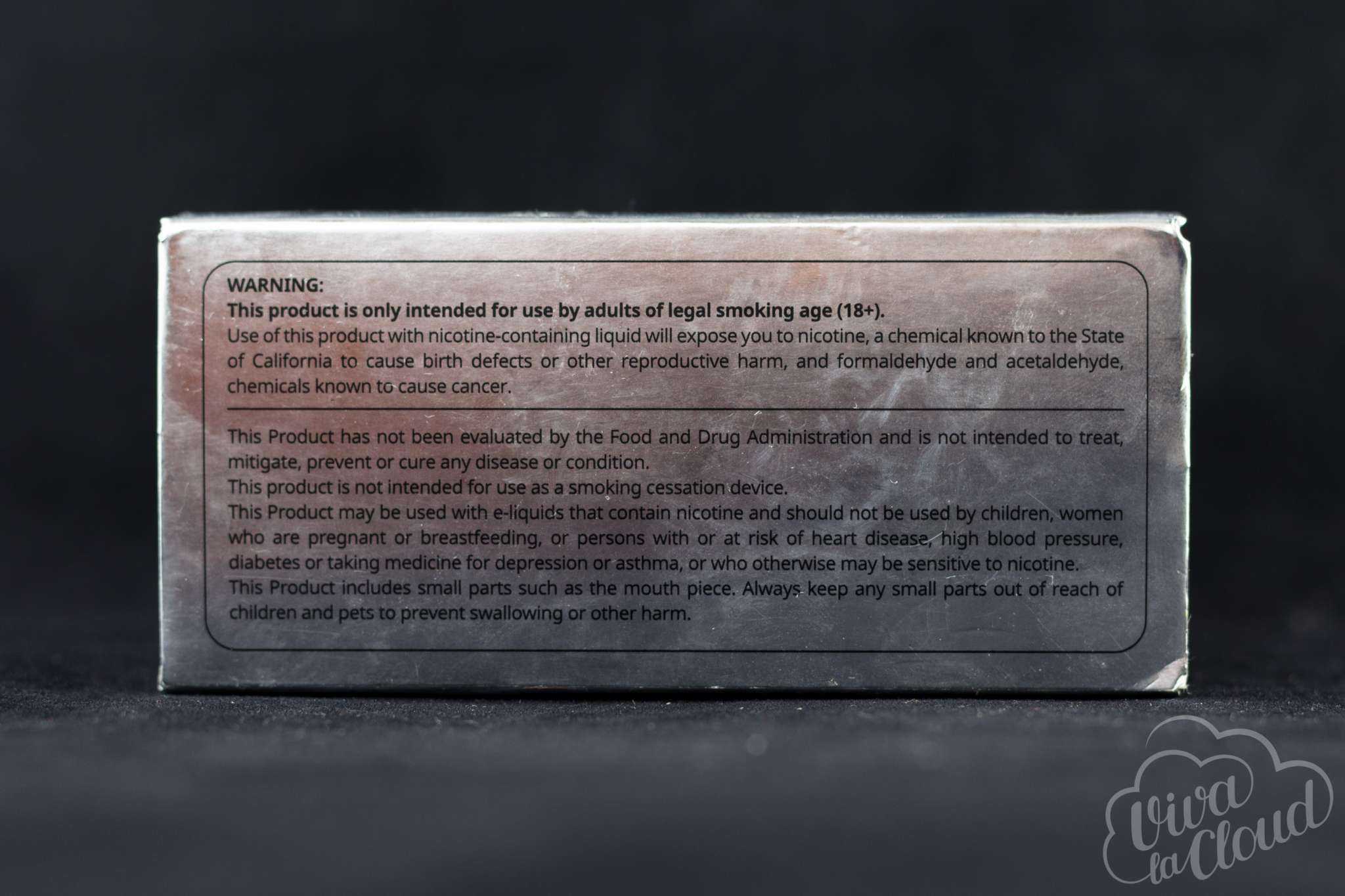 На задней стороне можно найти кучу разной информации и стикер проверки на оригинальность, а на боковой так вообще красуется огромное предупреждение о том, что данный продукт не предназначен для лиц младше 18 лет и много других заявлений, которые мы привыкли видеть на этикетках американских жидкостей, но никак не на коробках китайских устройств для парения.