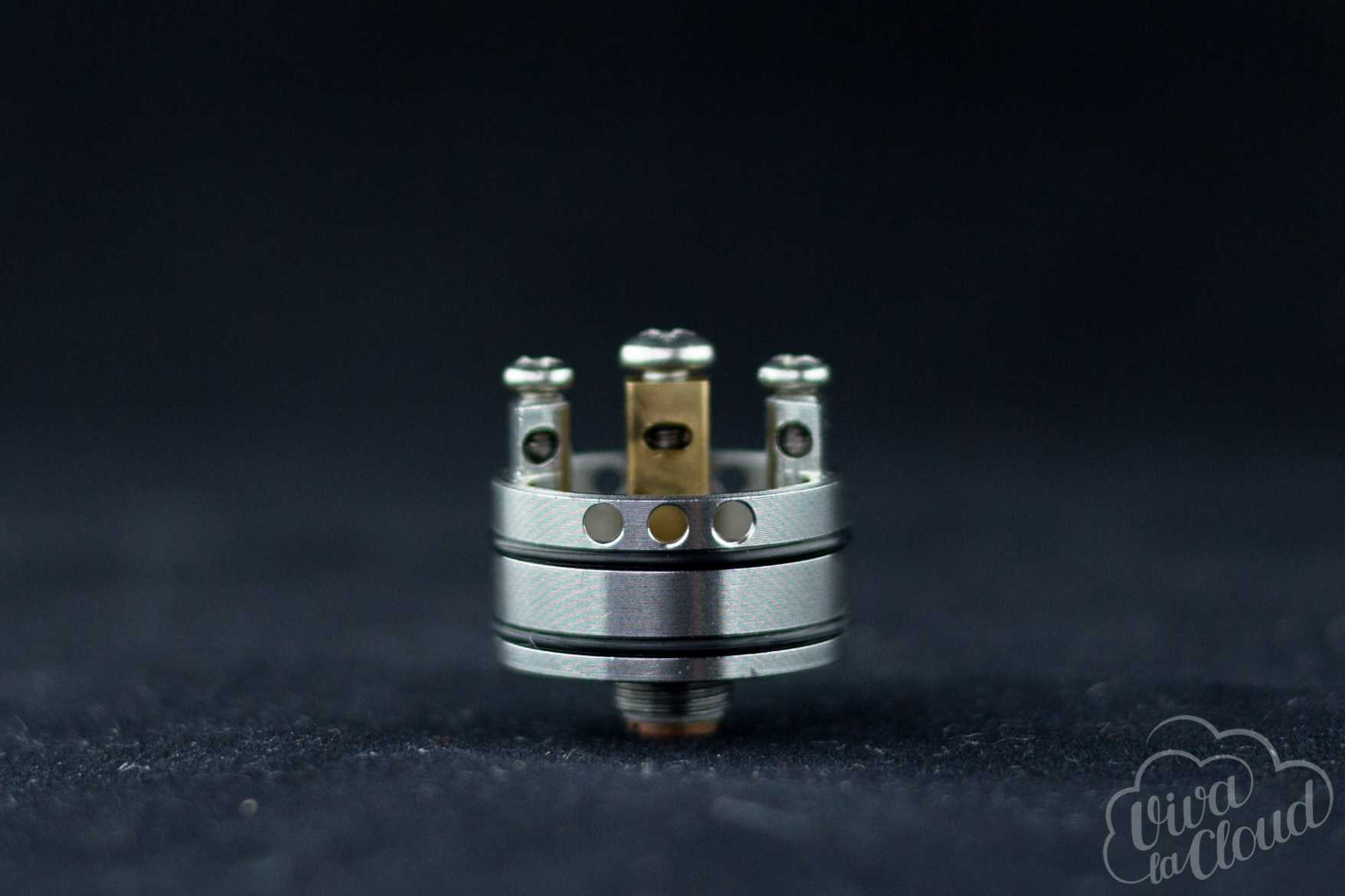 Корпус держится на двух о-рингах. При этом, ни на самой ни на базе, ни на корпусе нет ограничителей — если на мехмодах юбка упирается в площадку, и все вроде бы хорошо, то на боксмодах со специальной формочкой под сбор жидкости (как на RX200S, например) конструкция сползает вниз, тем самым сбивая обдув. Контакт выступает достаточно для использования Limitless CC RDA с гибридными механическими модами.