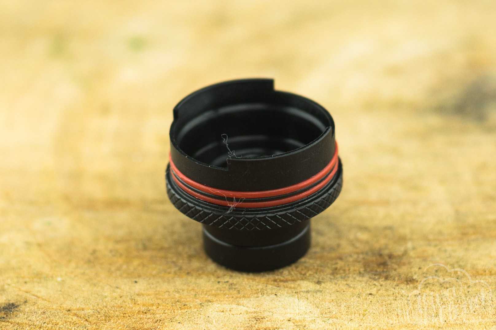 Топ-кэп выполнен из делрина и имеет шторки, прикрывающие отверстия обдува, а также насечки, облегчающие его поворот и вытаскивание. Сам по себе он низкий и широкий, и если вам не требуется такое огромное количество воздуха, то стоит вставить комплектный дрип-тип, на первый взгляд похожий на переходник. К сожалению, любителей классики здесь ждет разочарование: любимый кастомный дрип-тип из стабилизированного дерева сюда не засунешь.