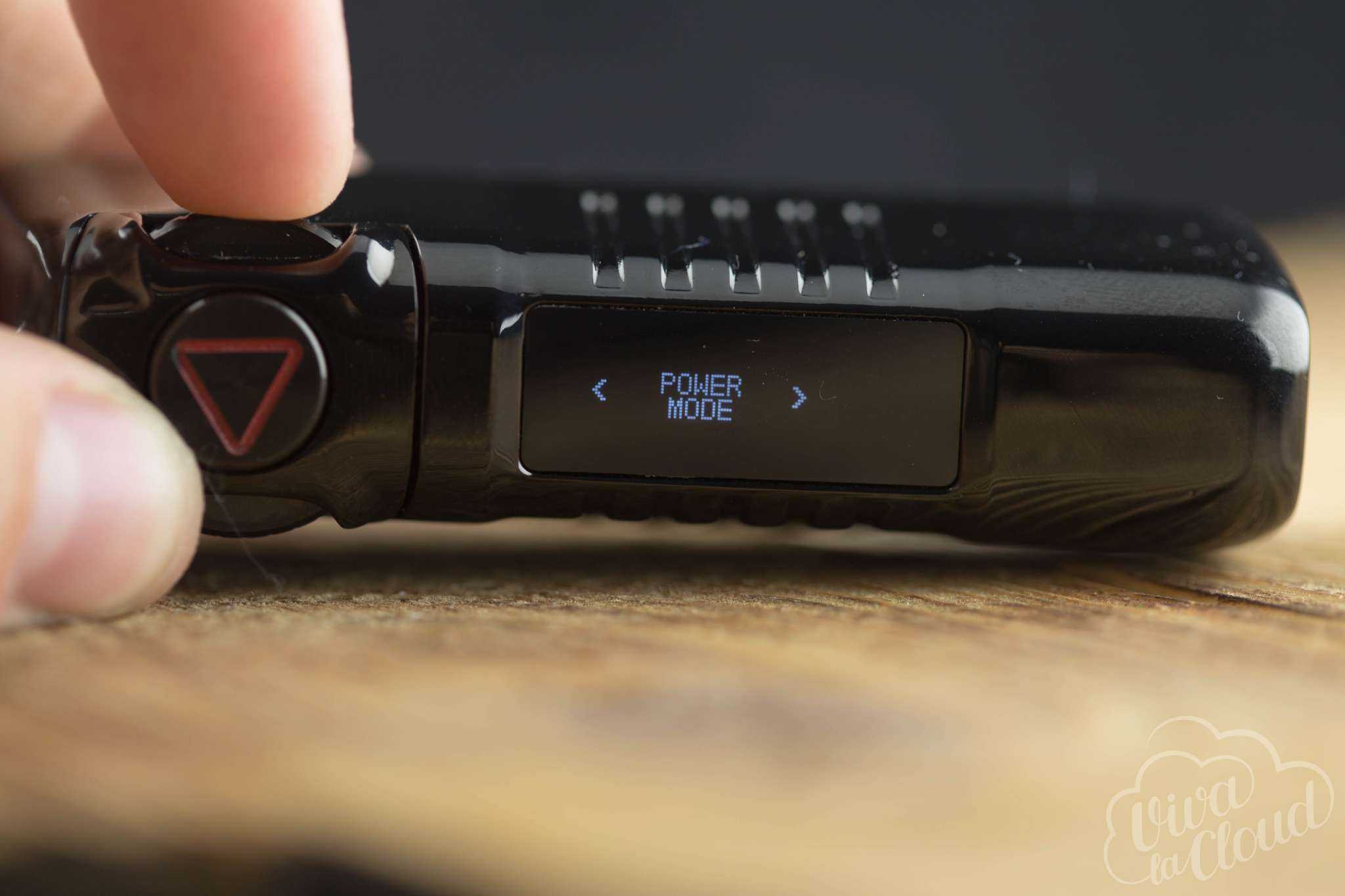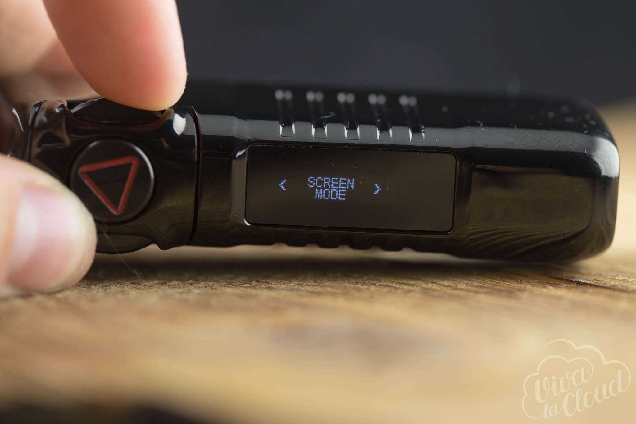Ниже расположен дисплей, небольшой, но довольно удобный и четкий. Он отображает всю необходимую информацию: мощность, сопротивление, напряжение, режим и заряд аккумулятора.