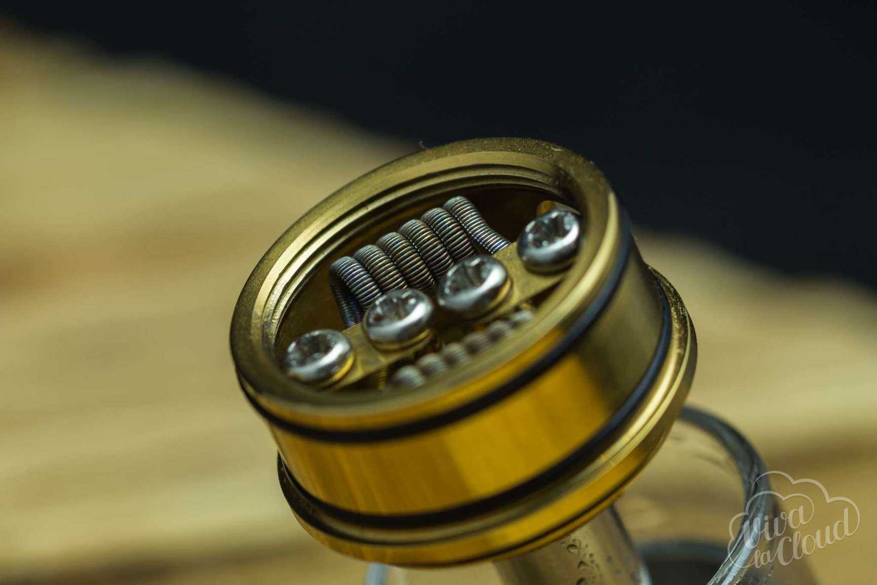 Заправка осуществляется через специальное отверстие, расположенное сбоку в позолоченной проставке. Залить в Azeroth RDTA можно 4 мл жидкости, что при диаметре в 24 мм и высоте в 40 мм вполне себе нормально.