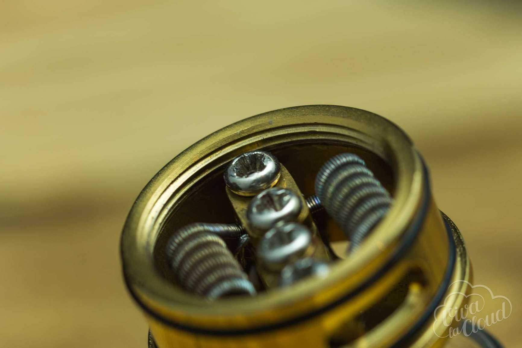 Azeroth RDTA перенял систему крепления спиралей у дрипки Goon. Это стойки с прижимными панелями, которые дают полную свободу в установке намоток. Действительно, вы можете туда засунуть даже самый жирный клэптон, что скорее всего и понадобится, если вы захотите попарить при полностью открытой подаче воздуха.
