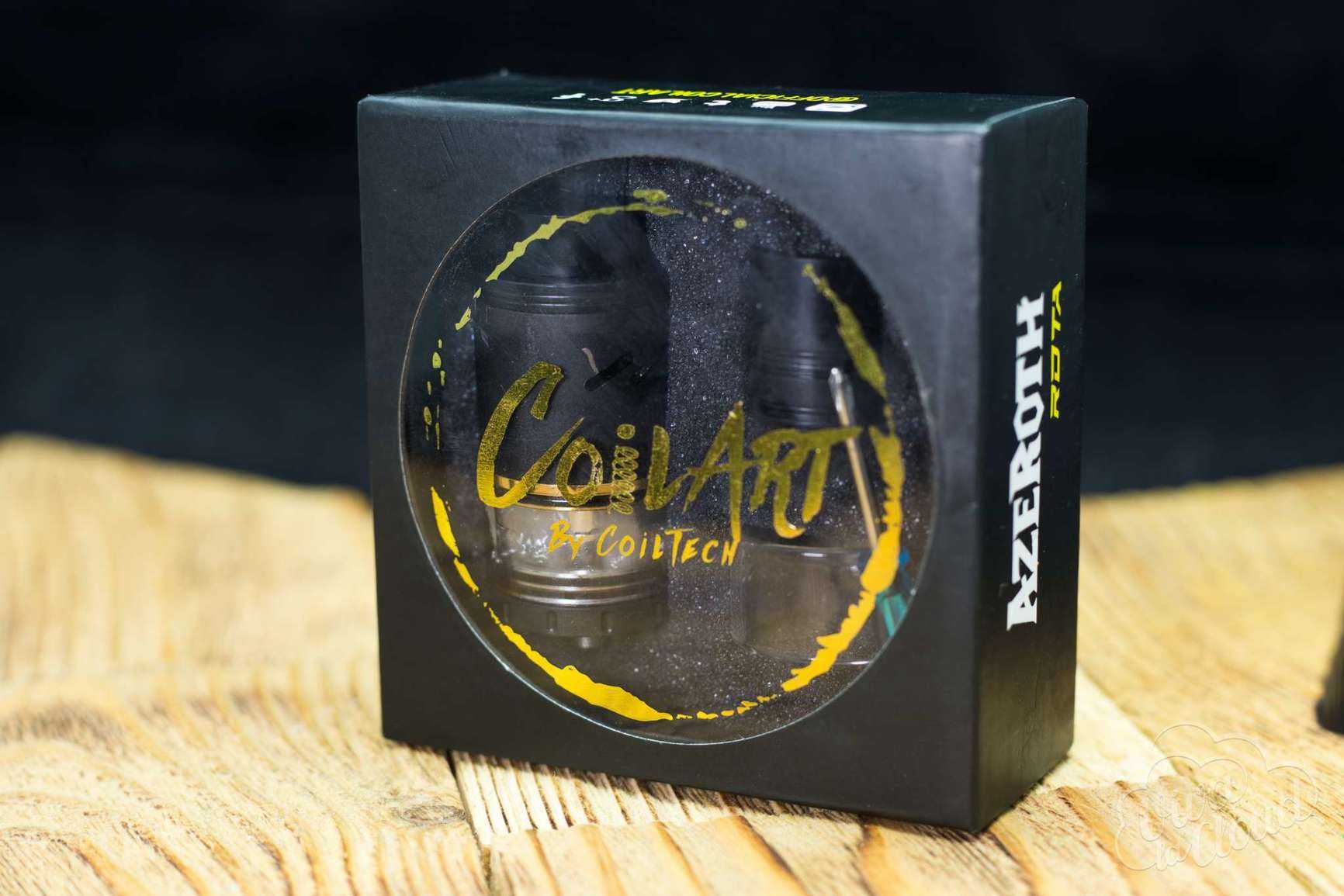 Поставляется Azeroth RDTA в уже привычной коробке для продуктов Coilart — это черный картон с вставкой из прозрачного пластика, где поверх нанесен логотип компании.